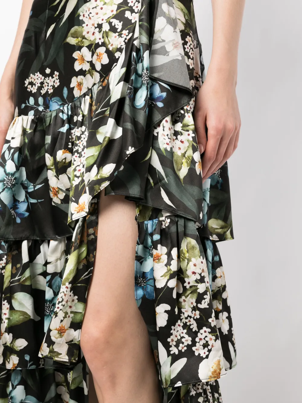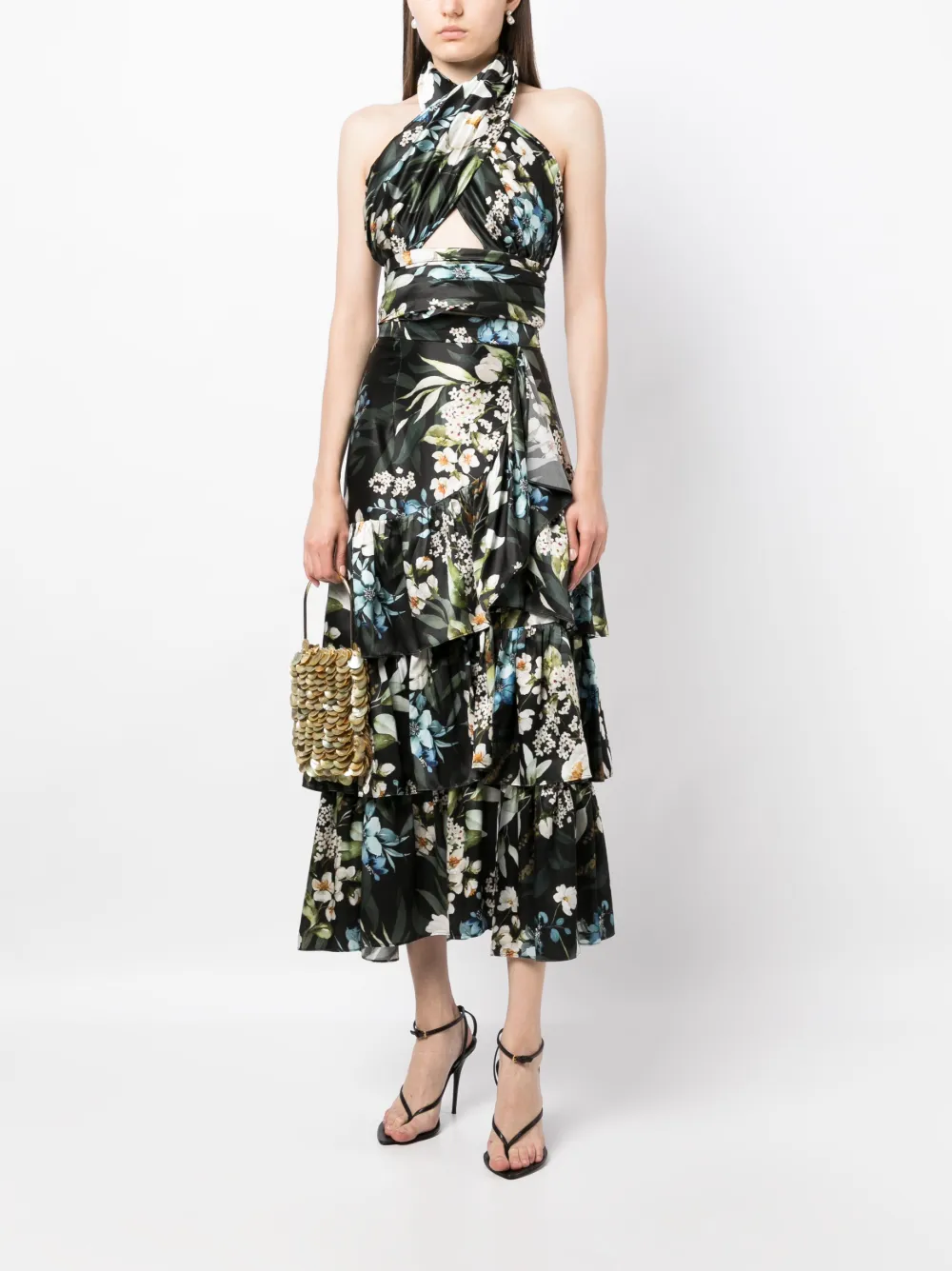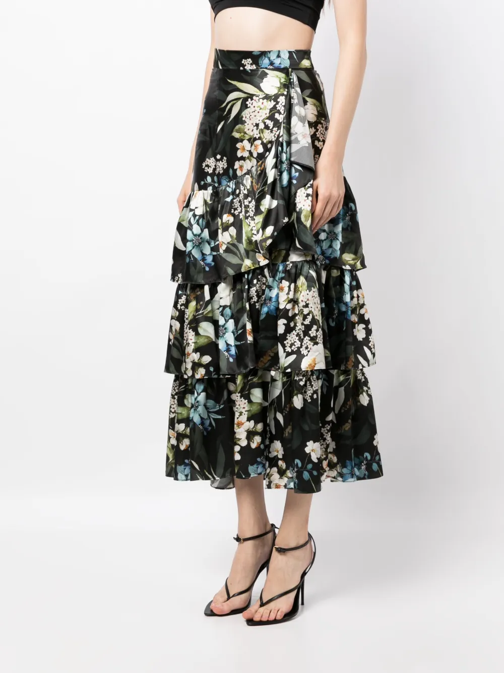 Черный/разноцветный, шелк, органза, сплошной цветочный принт, вставки с оборками, ярусная юбка, расклешенный подол и длина миди.