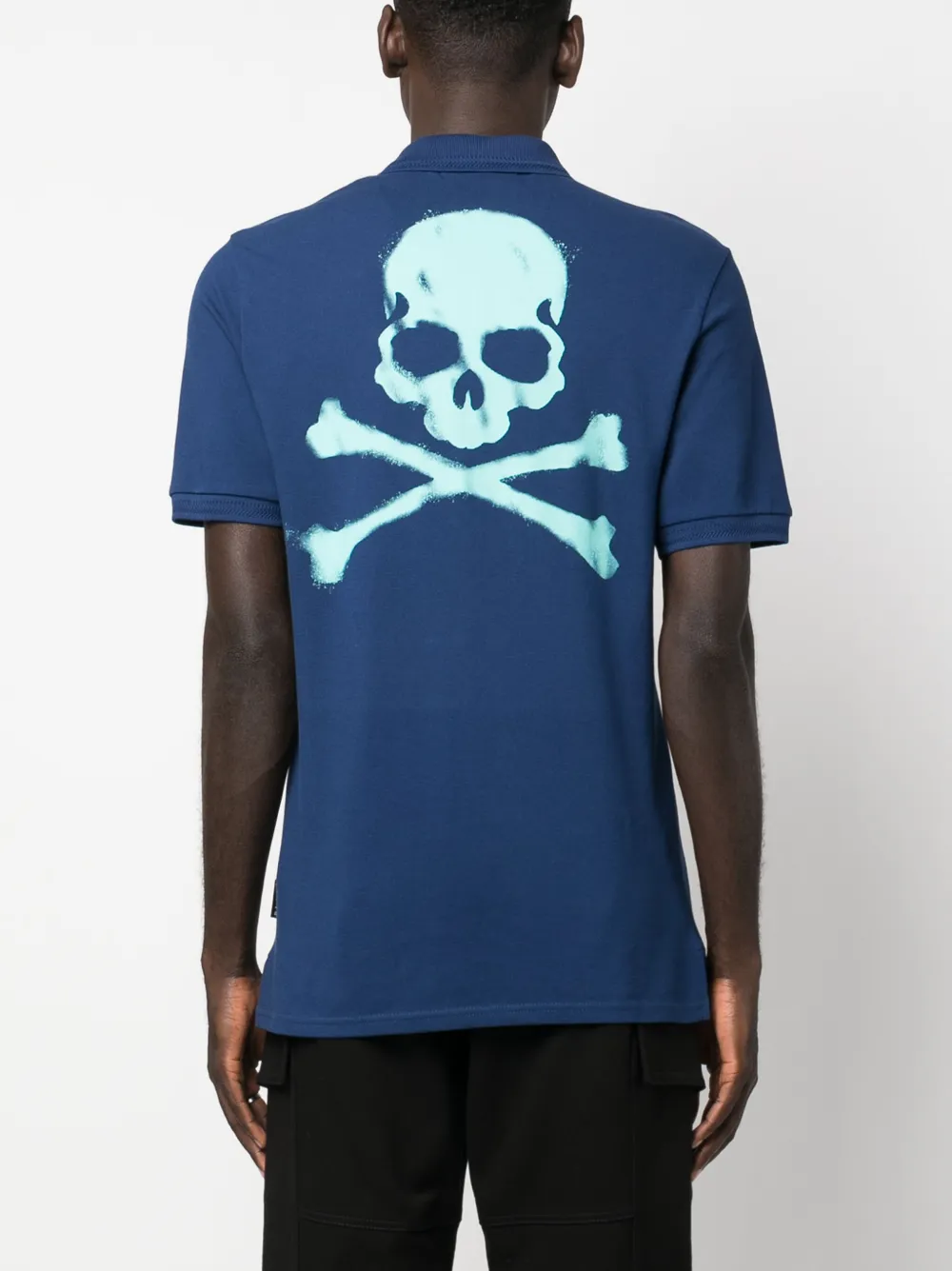 Темно-синий, хлопок, принт с логотипом на груди, принт с изображением черепа, металлический логотип, воротник поло, планка на пуговицах спереди, короткие рукава и прямой подол.
