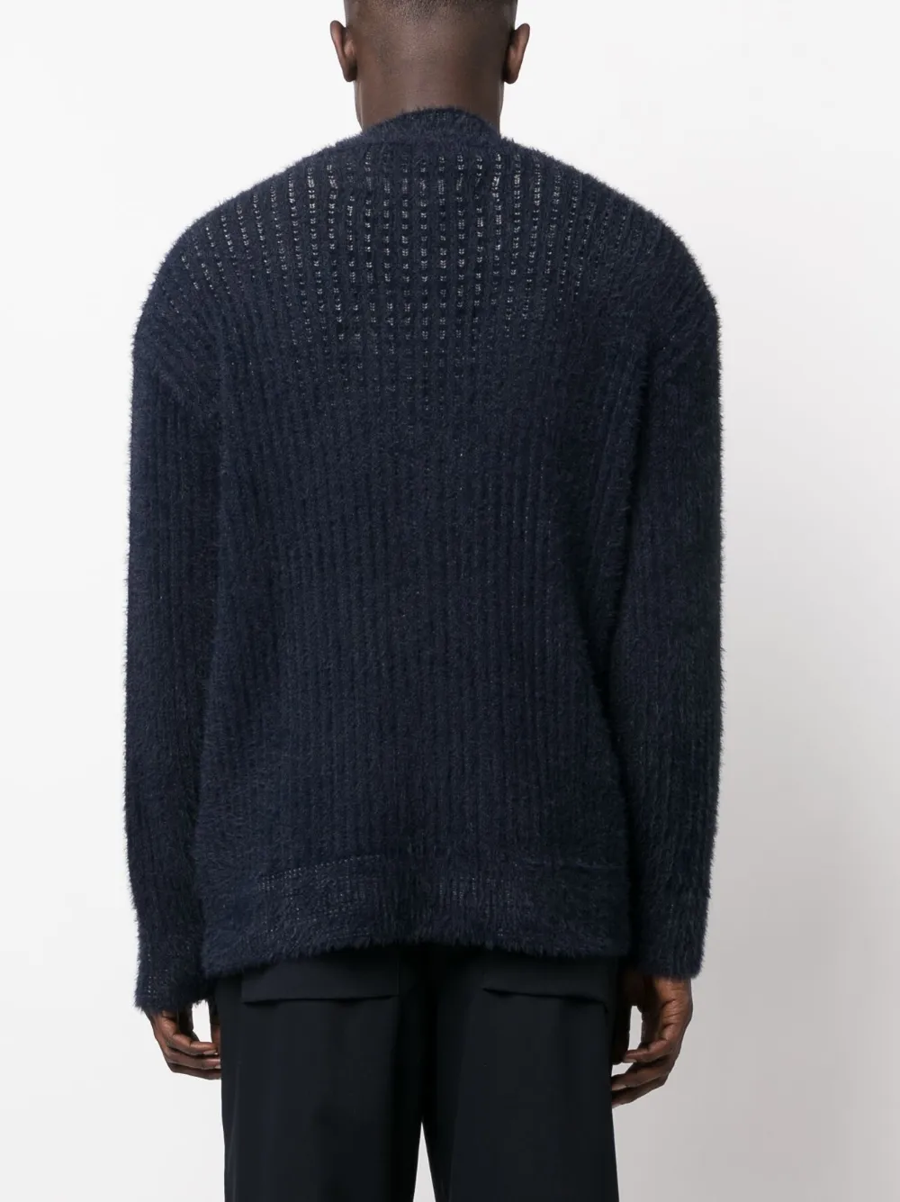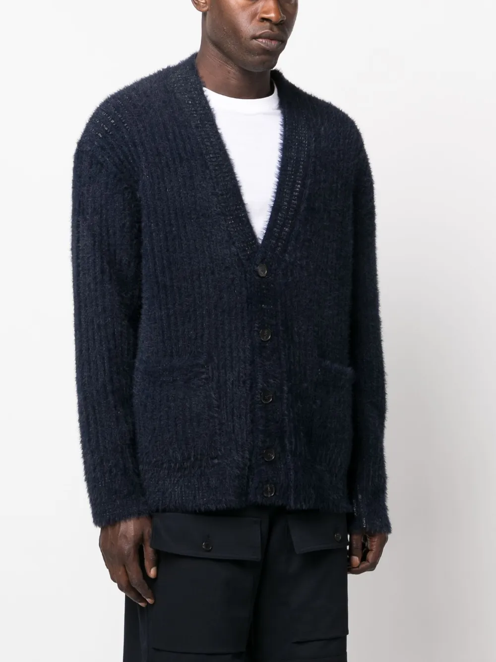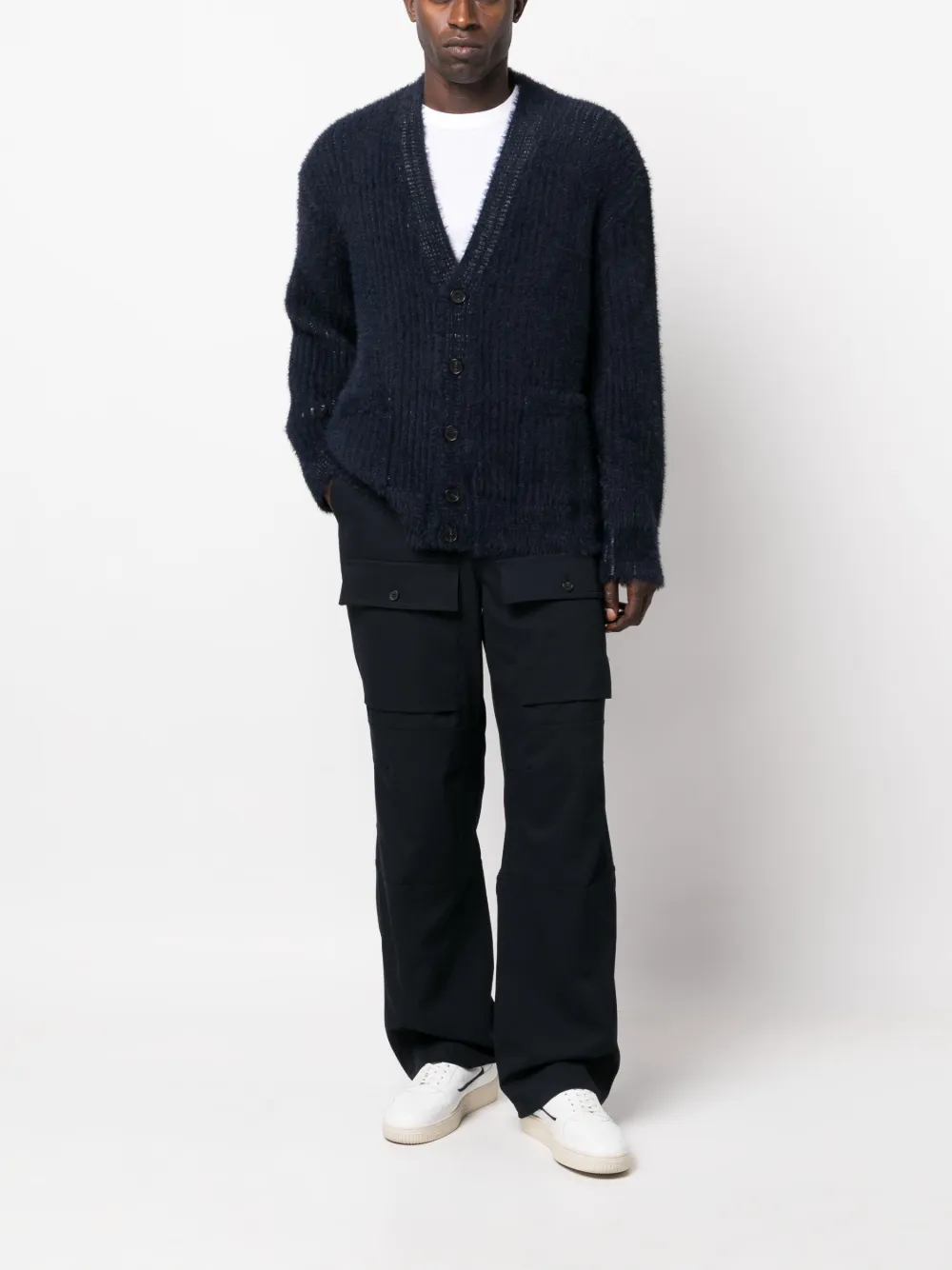 Темно-синий, трикотажный материал, глубокий V-образный вырез, застежка на пуговицах спереди, два накладных кармана спереди и прямой подол. Эта модель, как и другие вещи Missoni, выполнена вручную, поэтому товар может незначительно отличаться от фотографий на сайте.