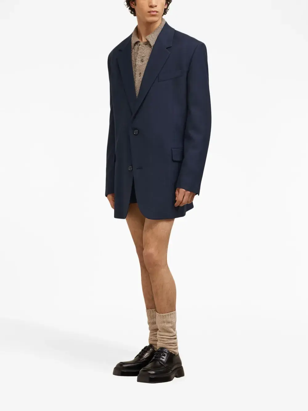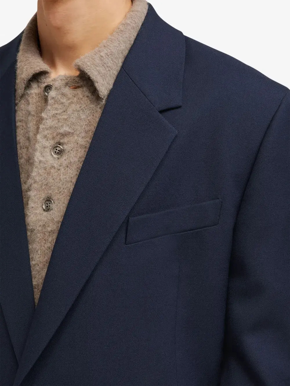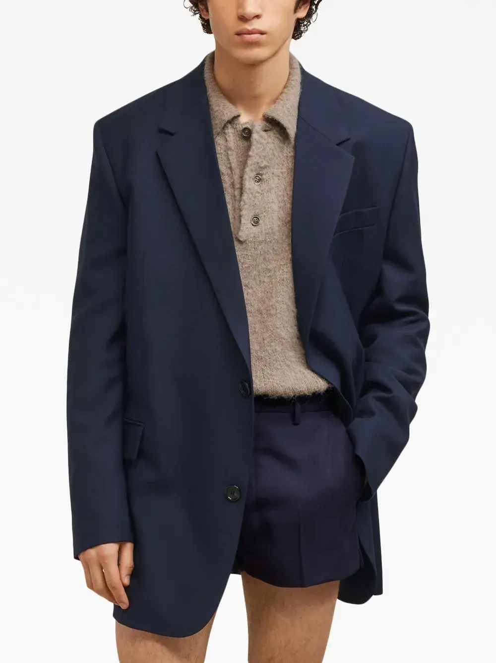 Темно-синий, необработанная шерсть, зазубренные лацканы, нагрудный прорезной карман, планка на пуговицах спереди, два кармана с клапанами по бокам, длинные рукава и шлица по центру сзади.