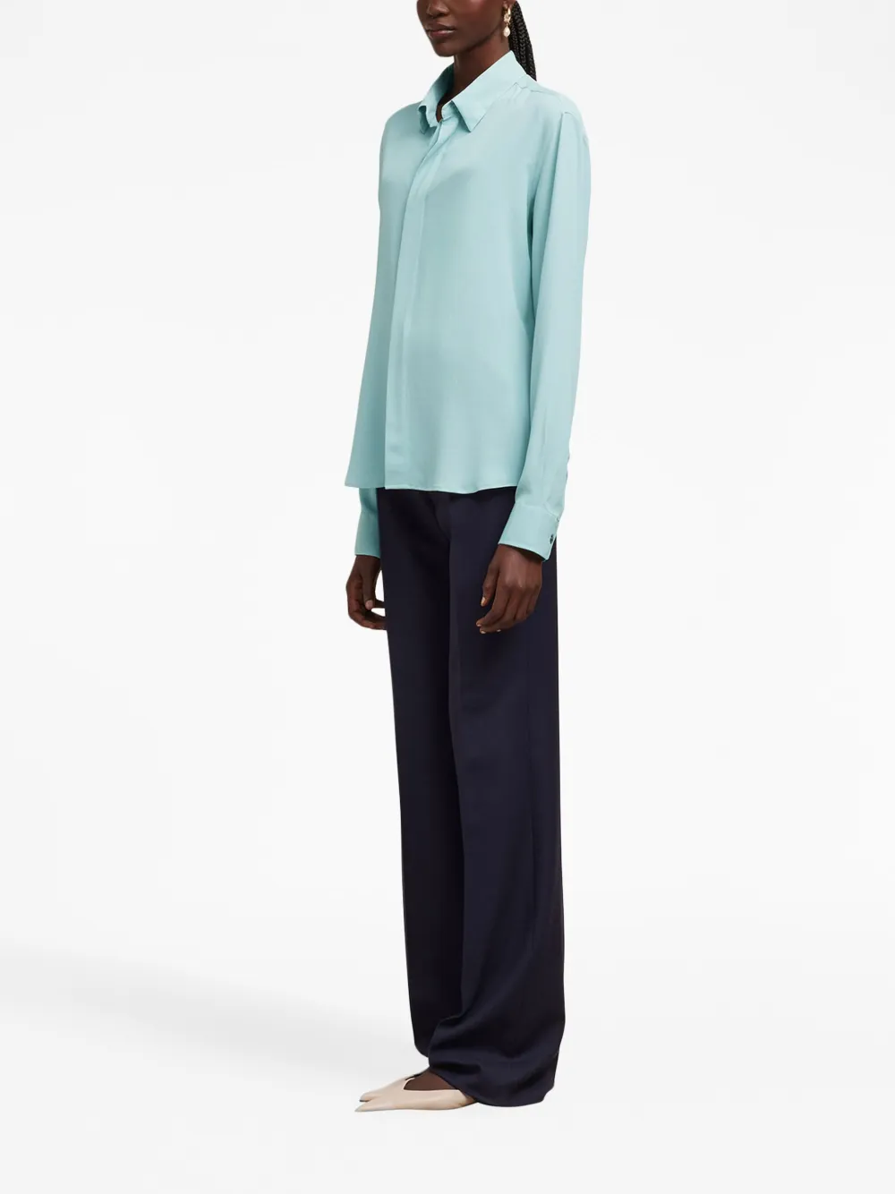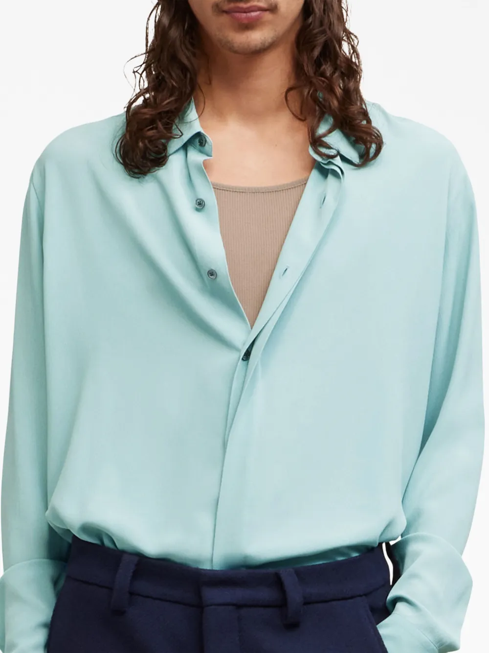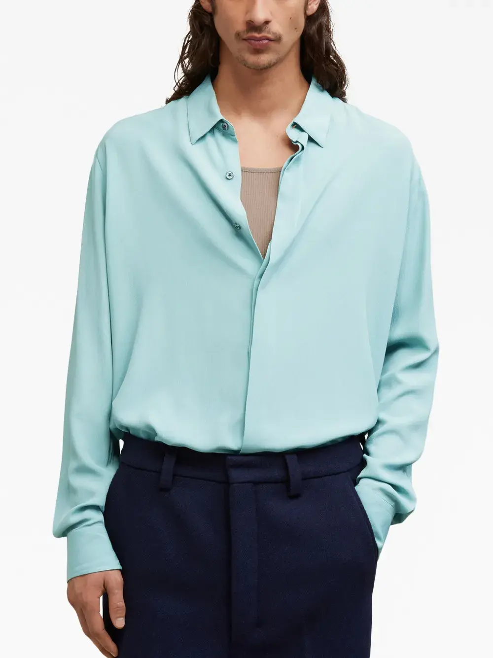 Сине-зеленый, креповая текстура, классический воротник, потайная пуговичная застежка спереди, длинные рукава, манжеты на пуговицах и закругленный подол сзади. Это унисекс-модель. Обратите внимание, что для нее используется мужская размерная сетка.