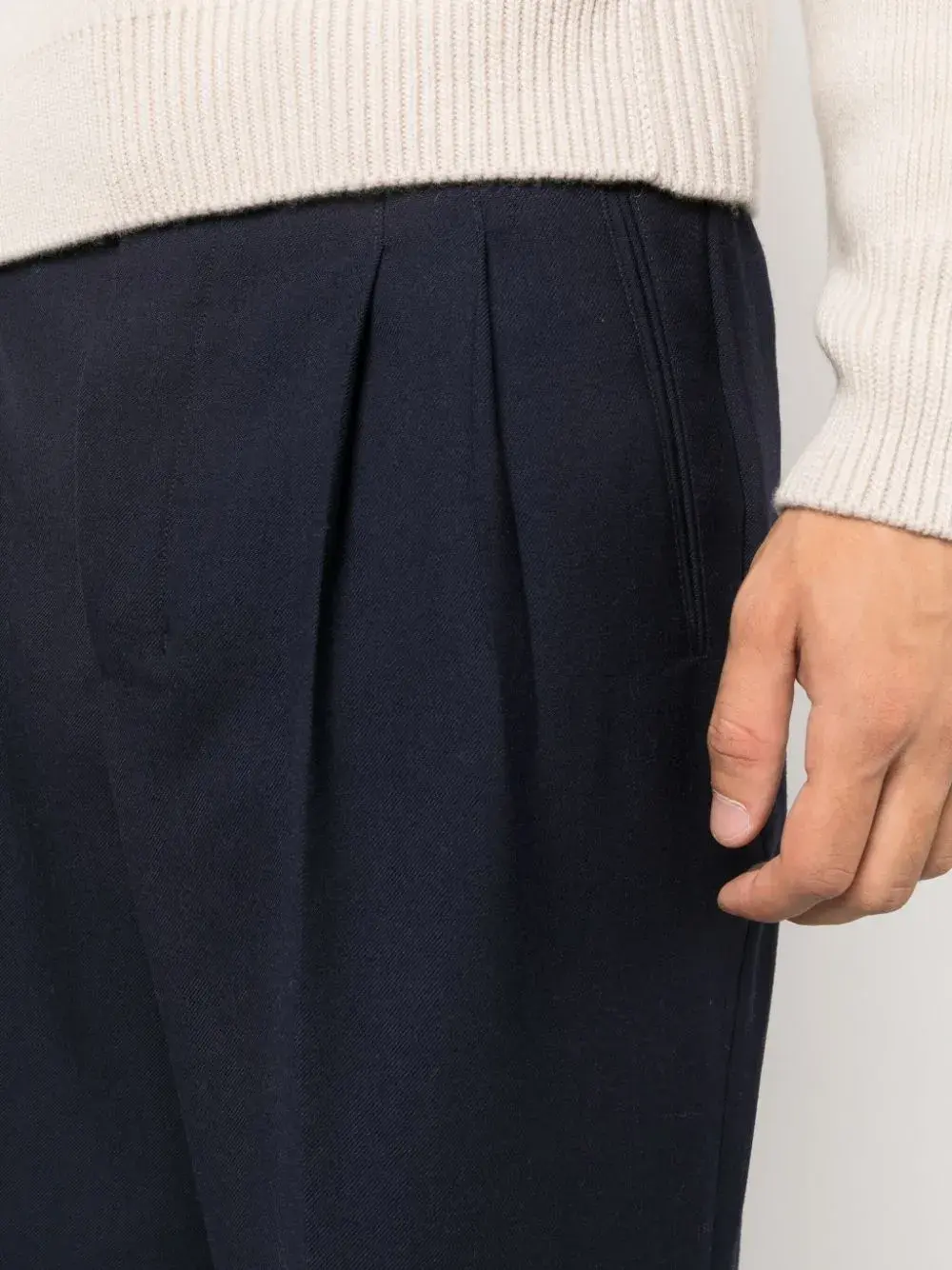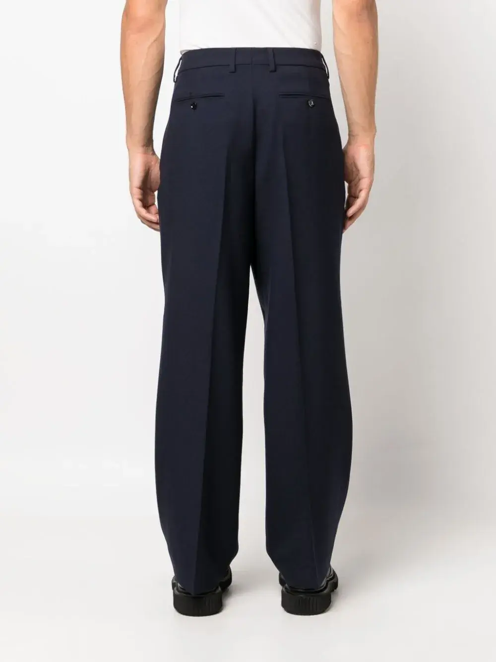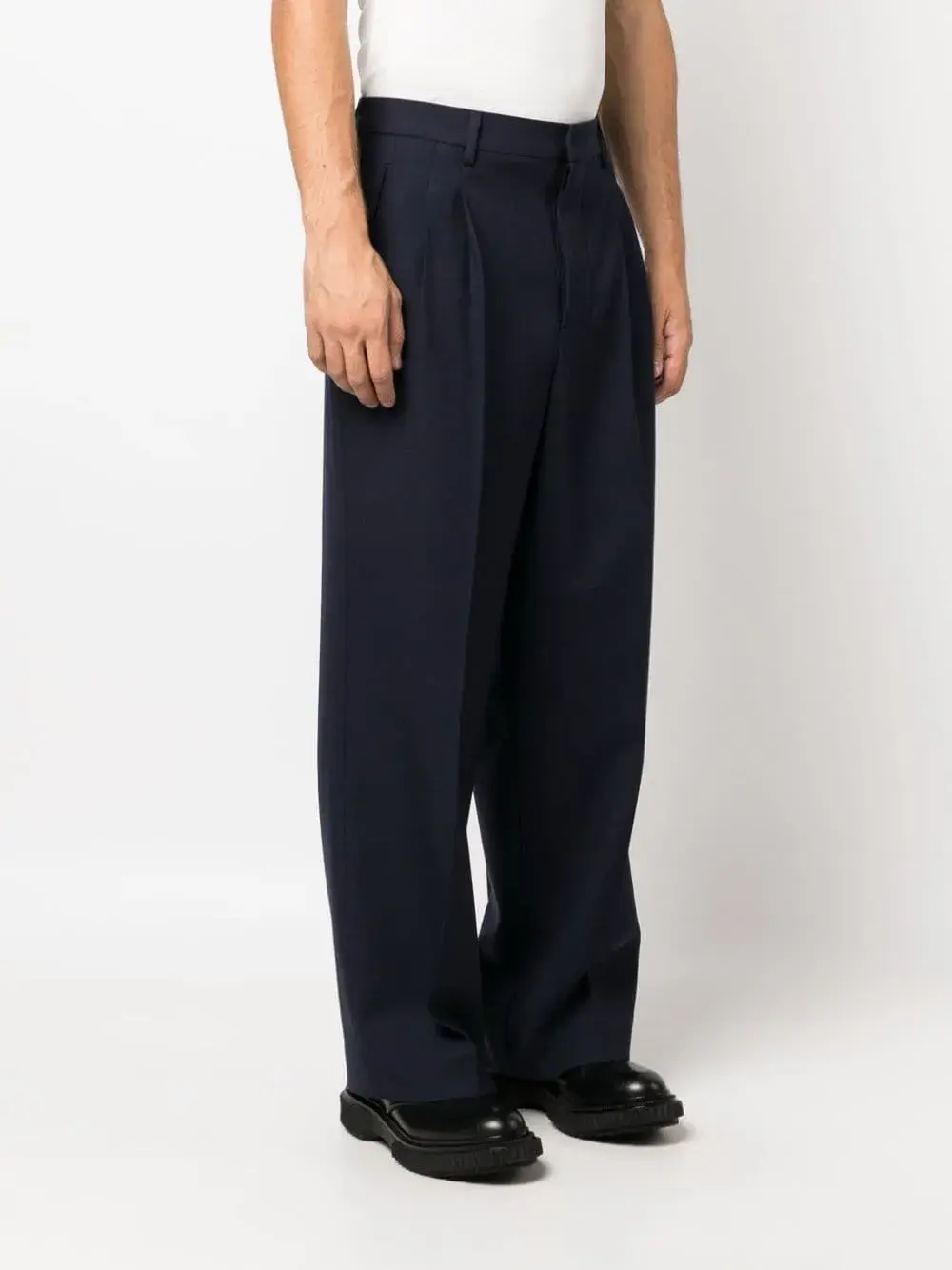 Темно-синий, петли для ремня, складки, прямой крой, потайная застежка спереди, два вшитых кармана по бокам и два прорезных кармана на пуговицах сзади.