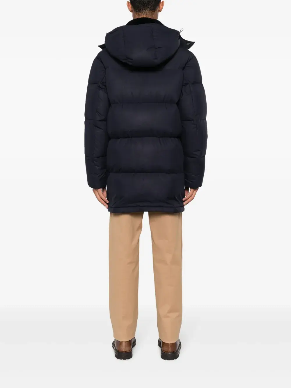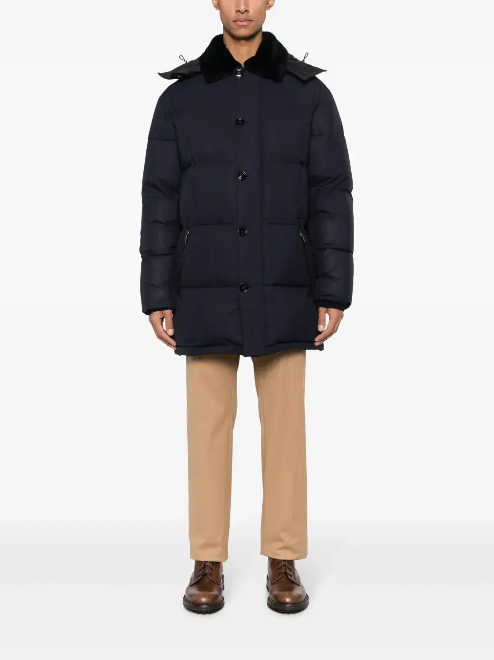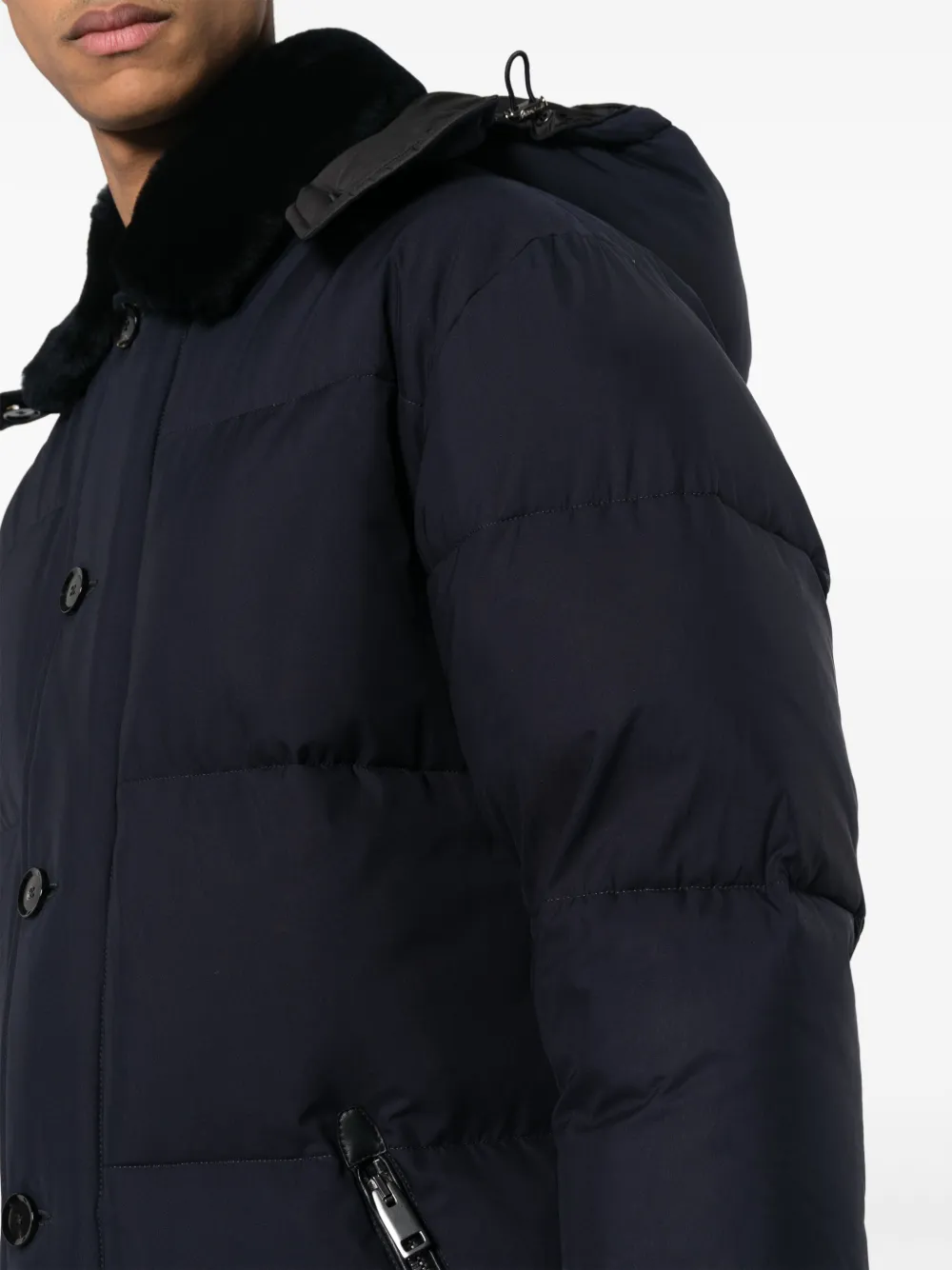 Темно-синий, наполнитель из пуха и перьев, дутый материал, застежка на пуговицах спереди, воротник из овечьей шерсти, съемный капюшон, длинные рукава, два кармана на молнии, подкладка из хлопка и прямой подол.