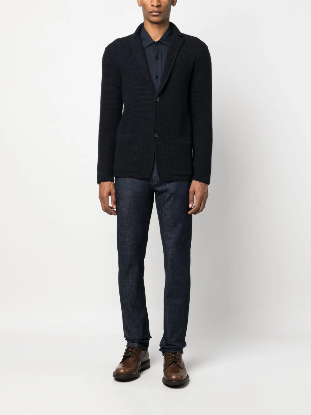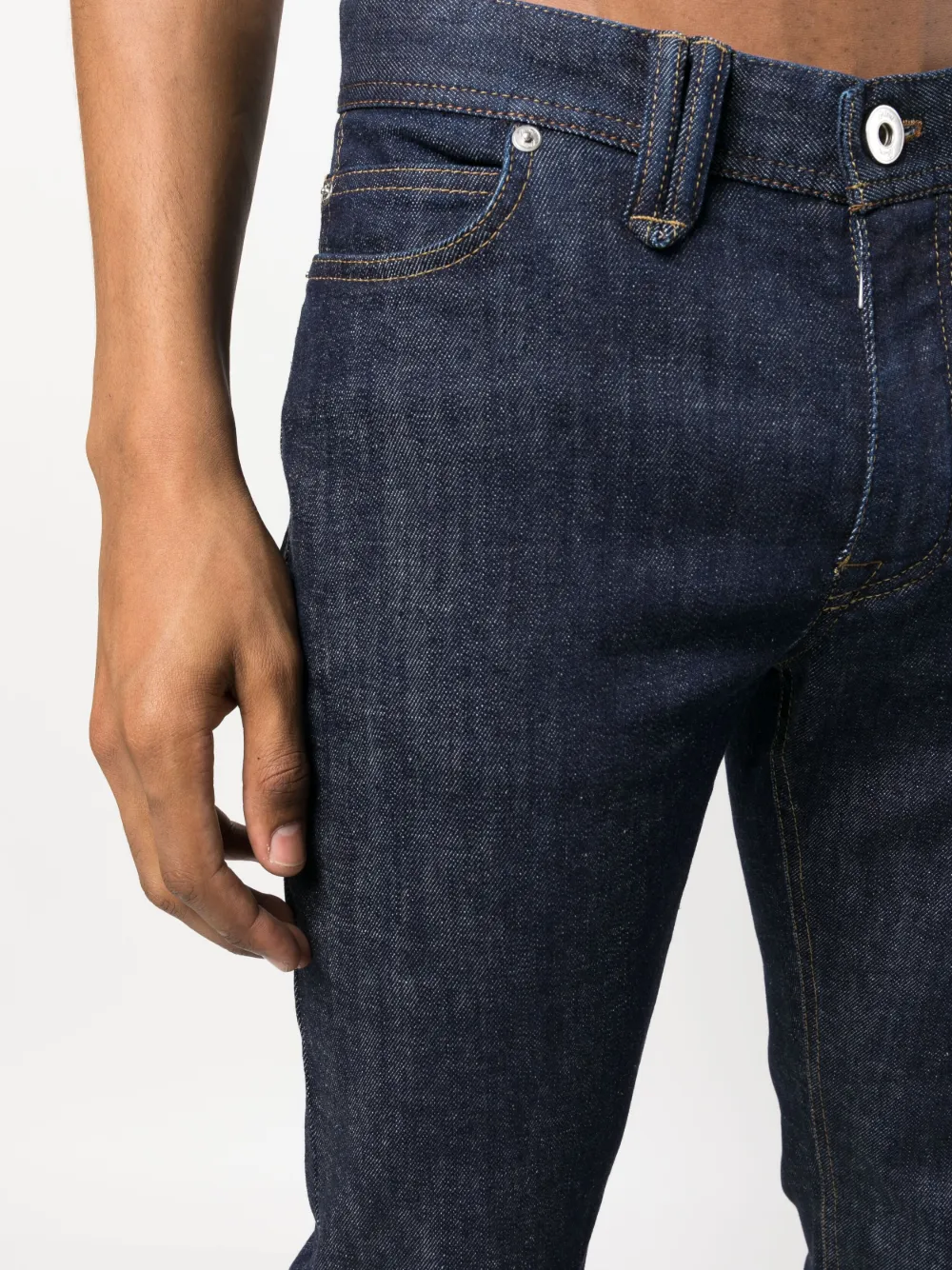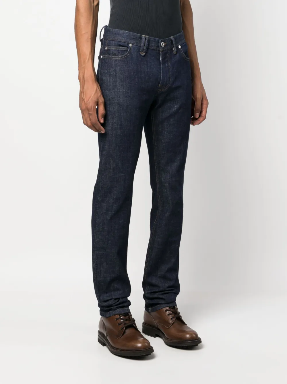 Индиго, эластичный хлопок, деним, нашивка с логотипом сзади, петли для ремня, застежка на молнии и пуговице спереди, средняя посадка, прямой крой и пять карманов.
