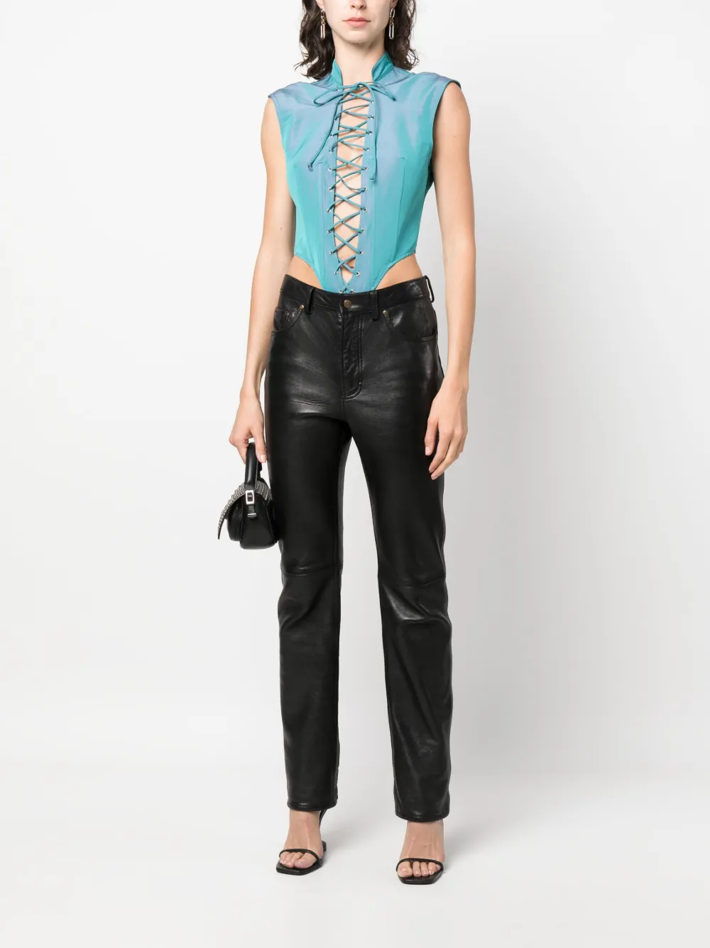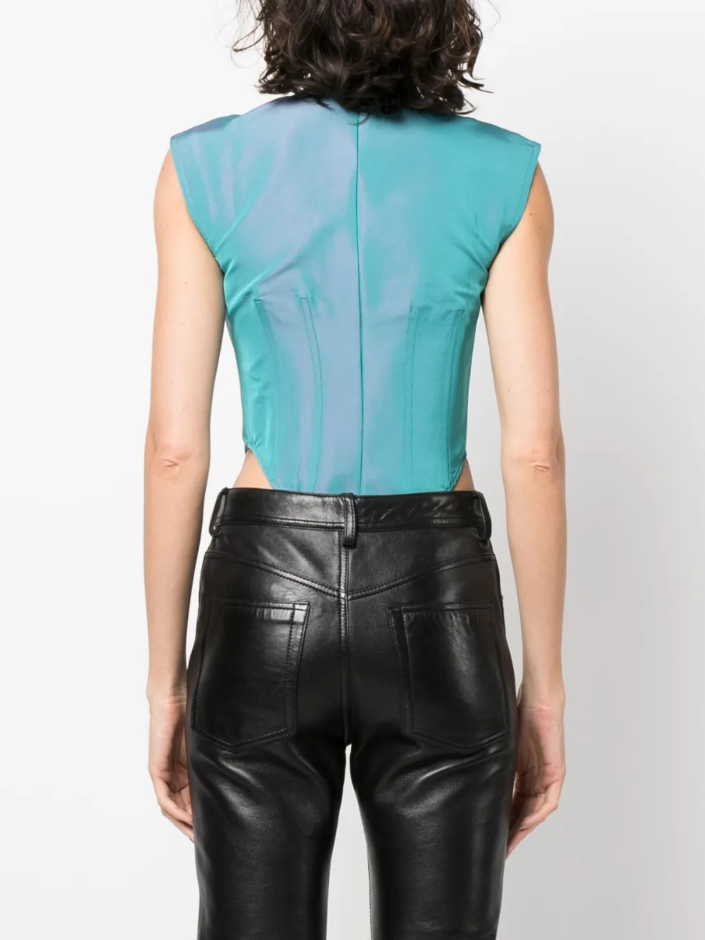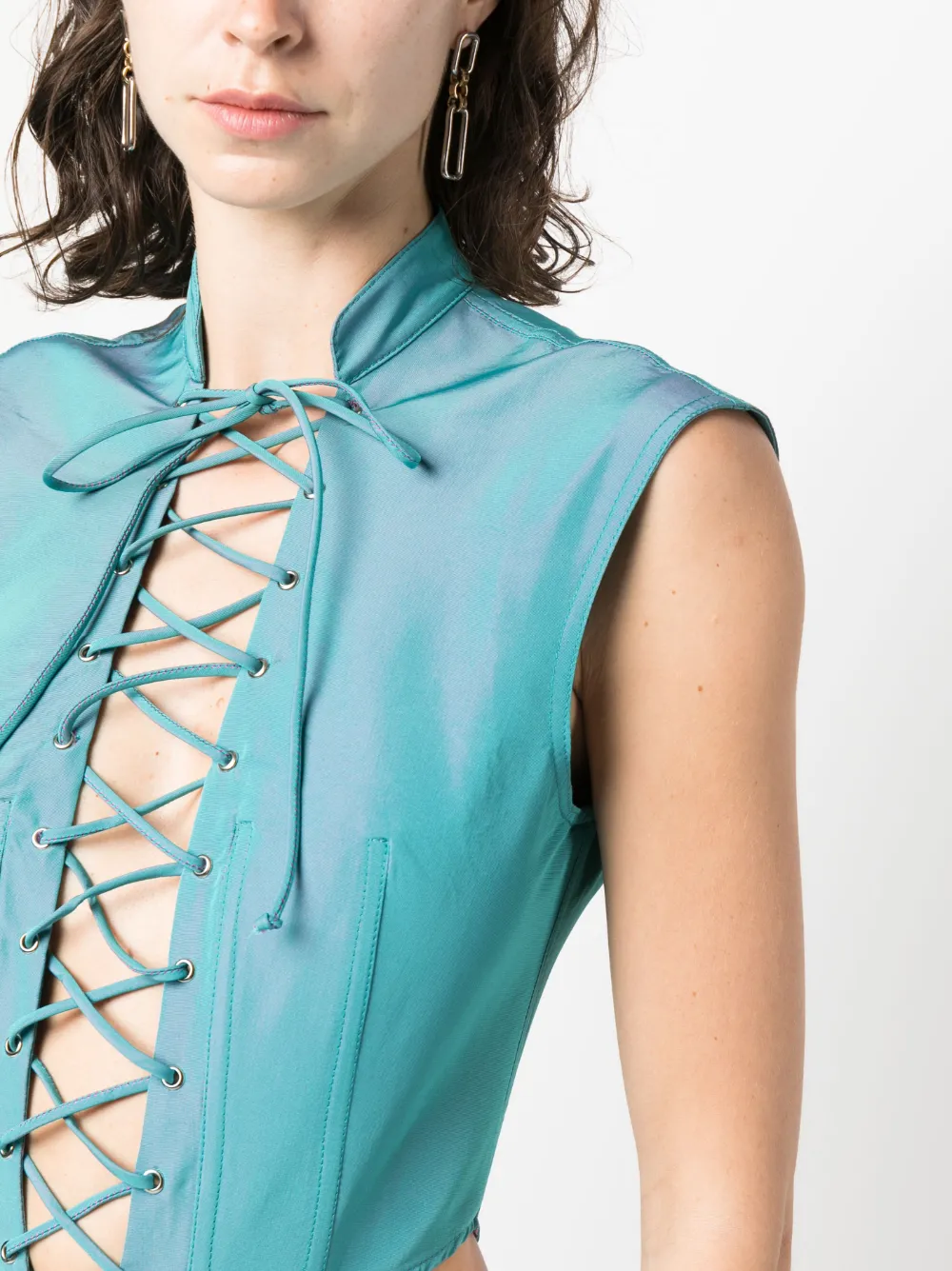 Сине-зеленый, воротник-стойка, шнуровка спереди, потайная застежка на молнии сзади и без рукавов. Эту вещь можно примерить, но только поверх собственного белья.