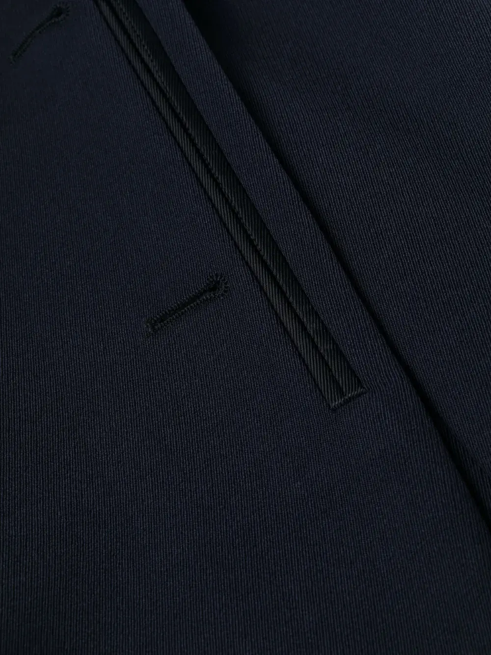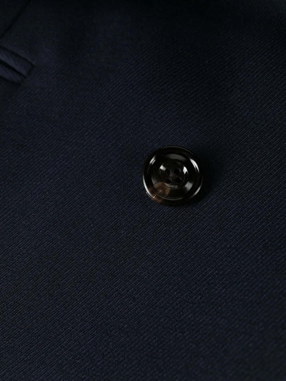 Темно-синий, хлопок, шерсть, заостренные лацканы, застежка на пуговицах спереди, нагрудный прорезной карман, два боковых кармана с листочкой, длинные рукава и прямой подол.
