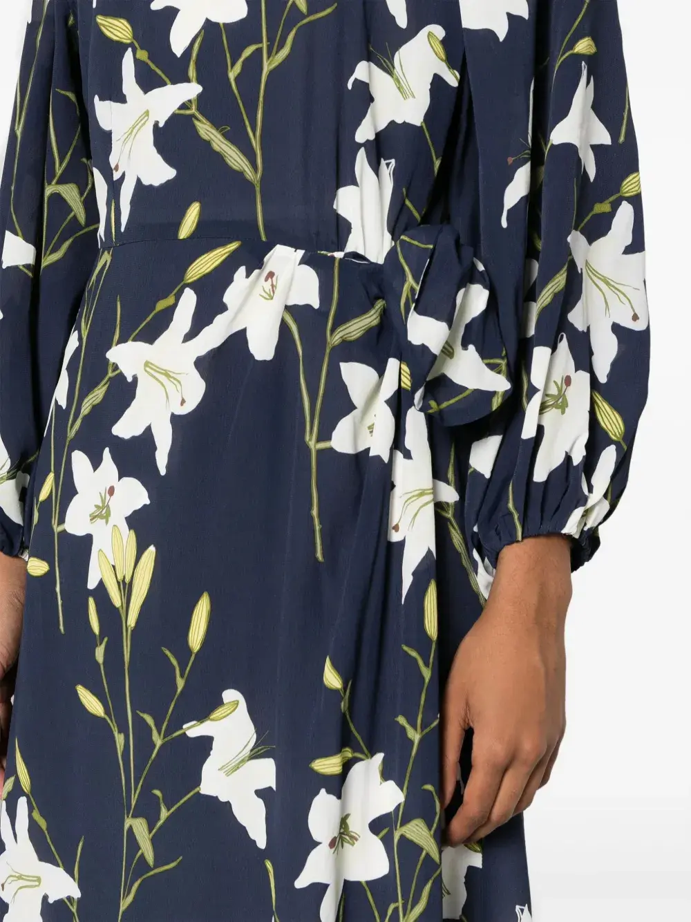 Темно-синий, белый, крепдешин, сплошной цветочный принт, круглый вырез, кулиска на талии, рукава «епископ» и длина макси.