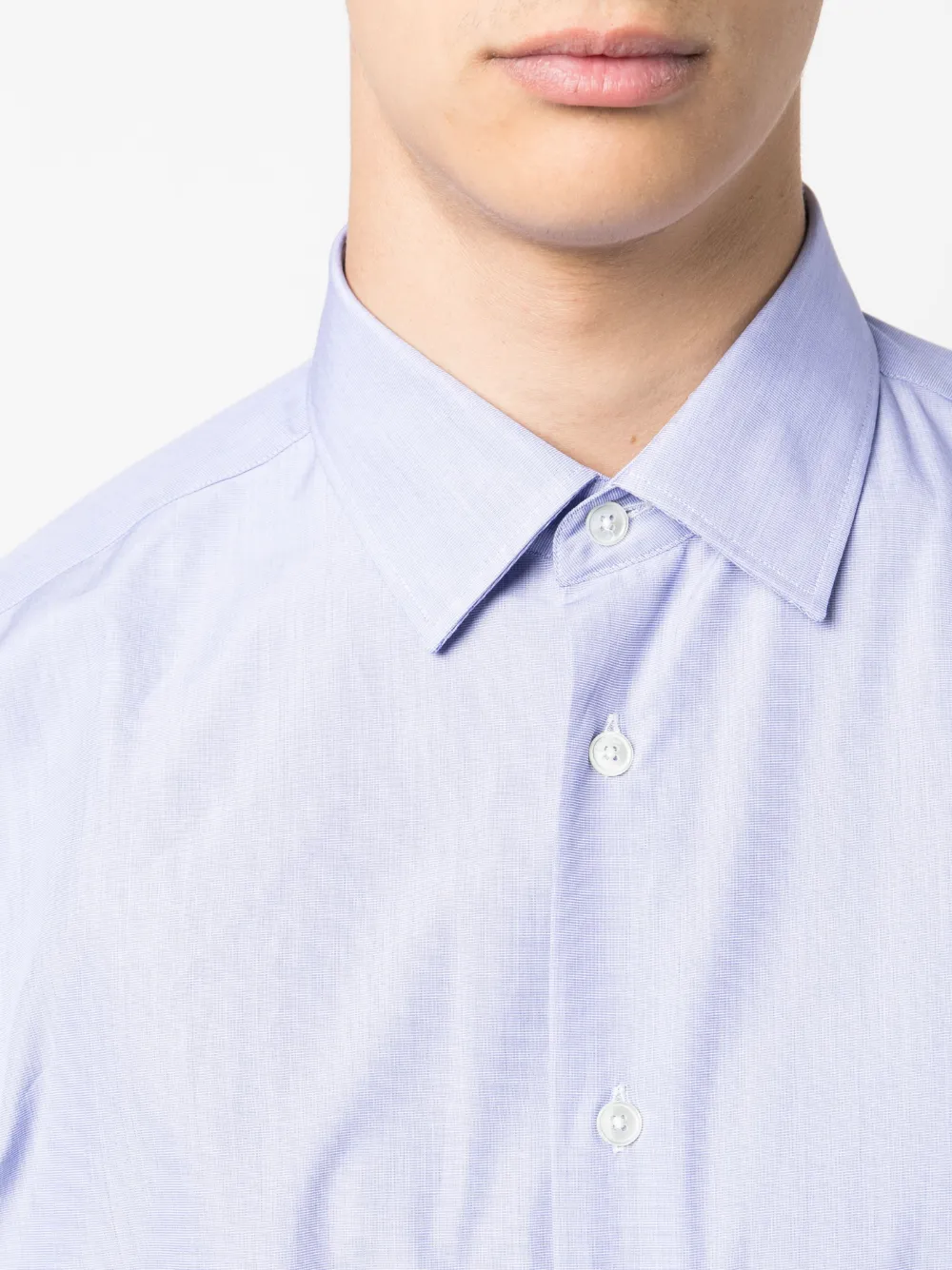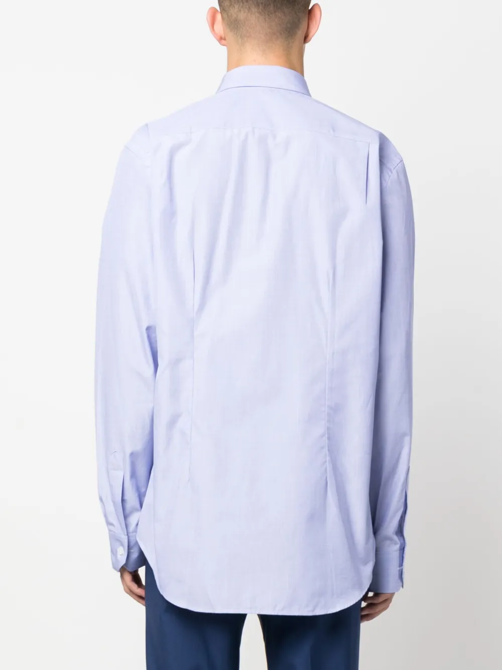 Голубой, хлопок, поплин, прямой воротник, застежка на пуговицах спереди, длинные рукава, манжеты на пуговицах и закругленный подол.