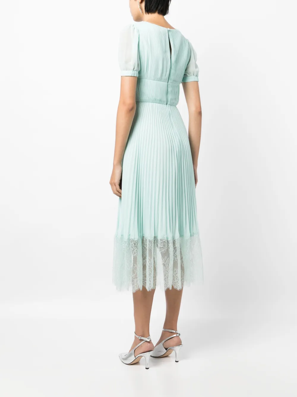 Подробнее о товаре: Голубой, переработанный полиэстер, плиссированная модель, кружевная отделка, V-образный вырез, короткие рукава и длина миди. Этот товар как минимум на 50% состоит из переработанных или повторно использованных материалов. Узнать больше о том, какие товары получают отметку «Ответственный выбор», можно из материала «Как мы оцениваем экологичность и этичность».