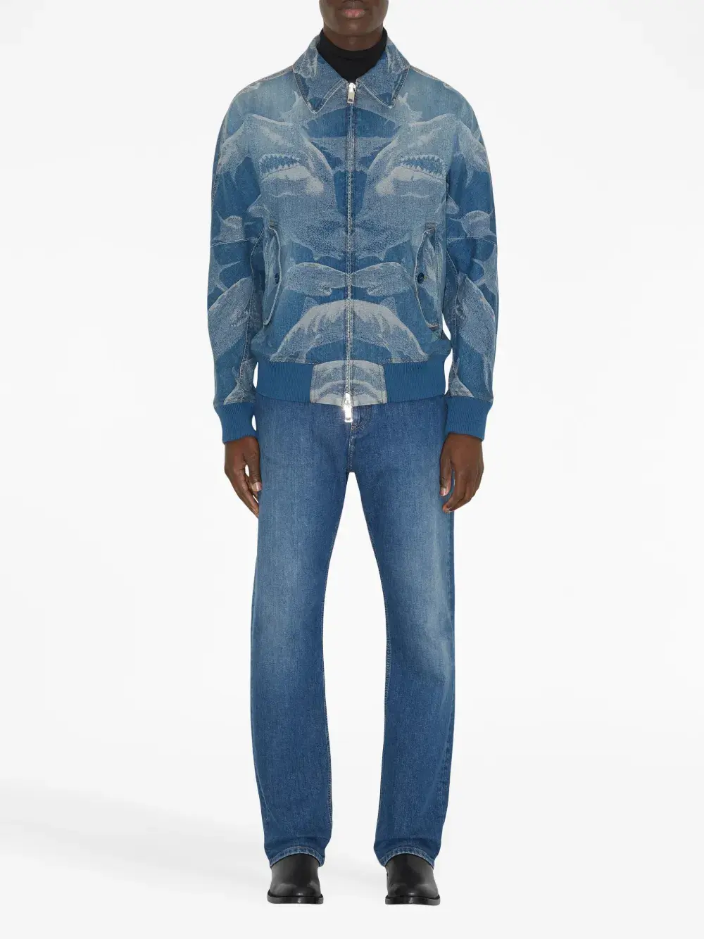 Темно-синий, эластичный хлопок, принт с изображением акулы, плоский заостренный воротник, двусторонняя молния спереди, два кармана с клапанами по бокам, длинные рукава, эластичные манжеты, эластичный подол и прямой подол.