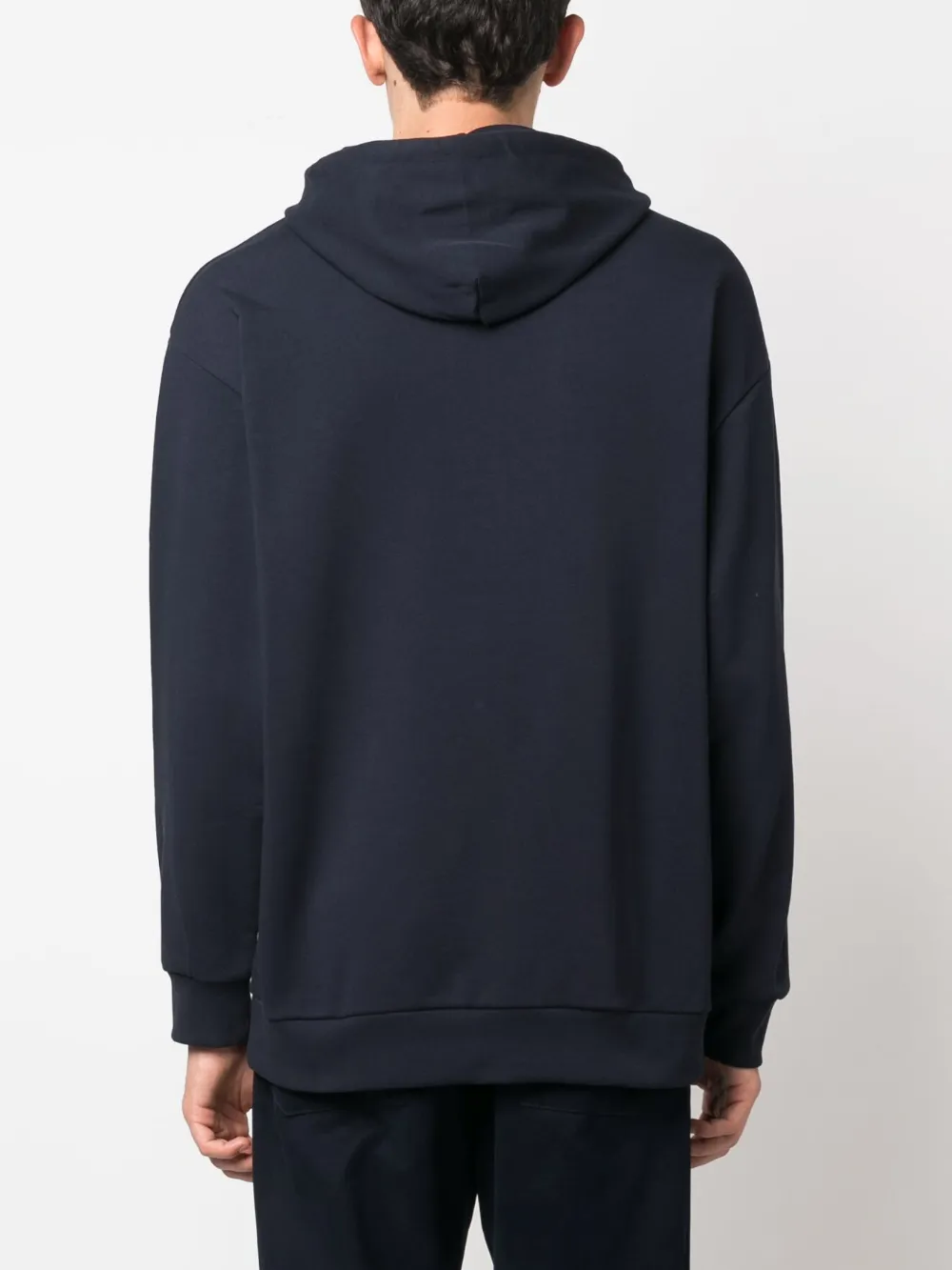 Темно-синий, органический хлопок, затягивающийся на шнурок капюшон, логотип спереди и отделка в рубчик.