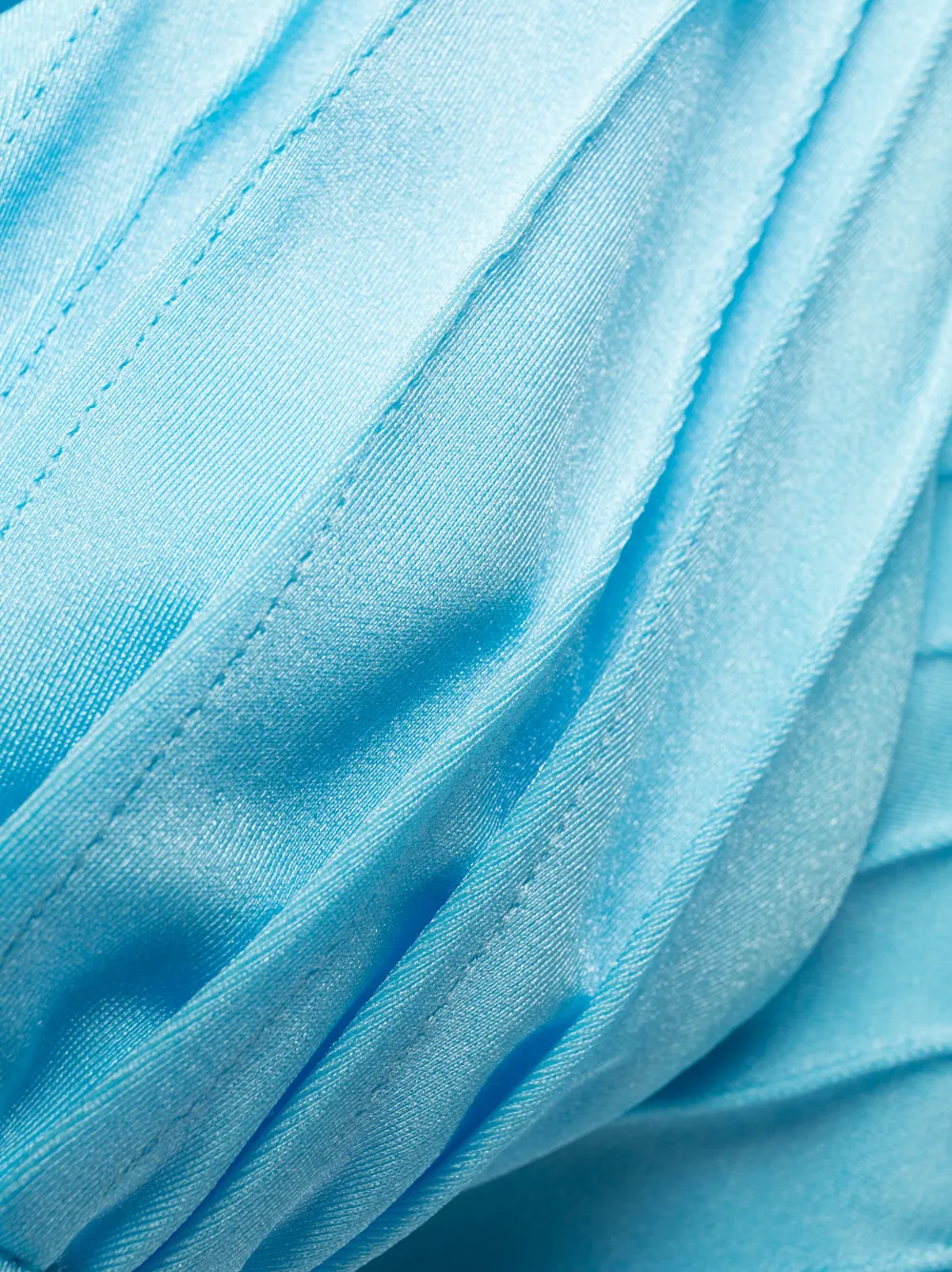 Голубой, эластичный материал, дизайн со сборками, треугольная чашка, завязки вокруг шеи, застежка на завязке сзади и низкая посадка. Пожалуйста, примеряйте купальники и пляжные шорты только поверх собственного белья.
