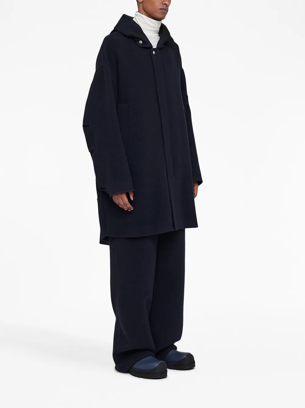 Темно-синий, необработанная шерсть, вырез сзади, классический капюшон, потайная застежка спереди, два прорезных кармана сбоку, длинные рукава и прямой подол.