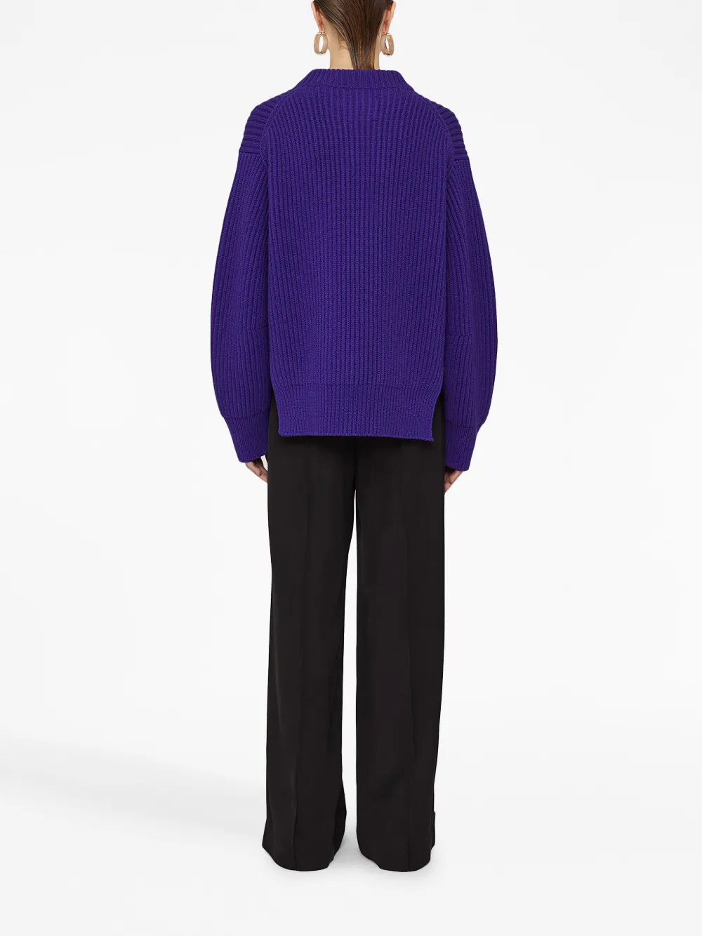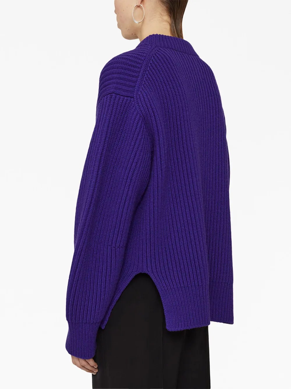 Синий, шерсть, трикотажный материал, круглый вырез, длинные рукава и неравномерный подол.