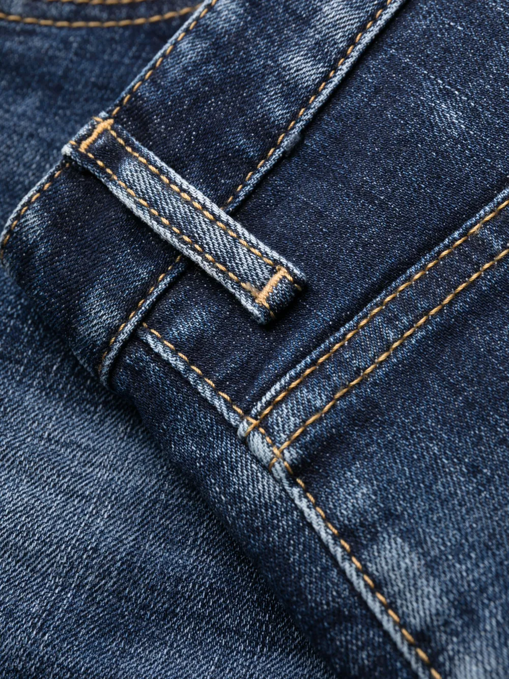 Индиго, эластичный хлопок, деним, эффект потертости, декоративные складки, нашивка с логотипом сзади, петли для ремня, низкая посадка, ширинка на пуговицах, прямой крой и пять карманов.