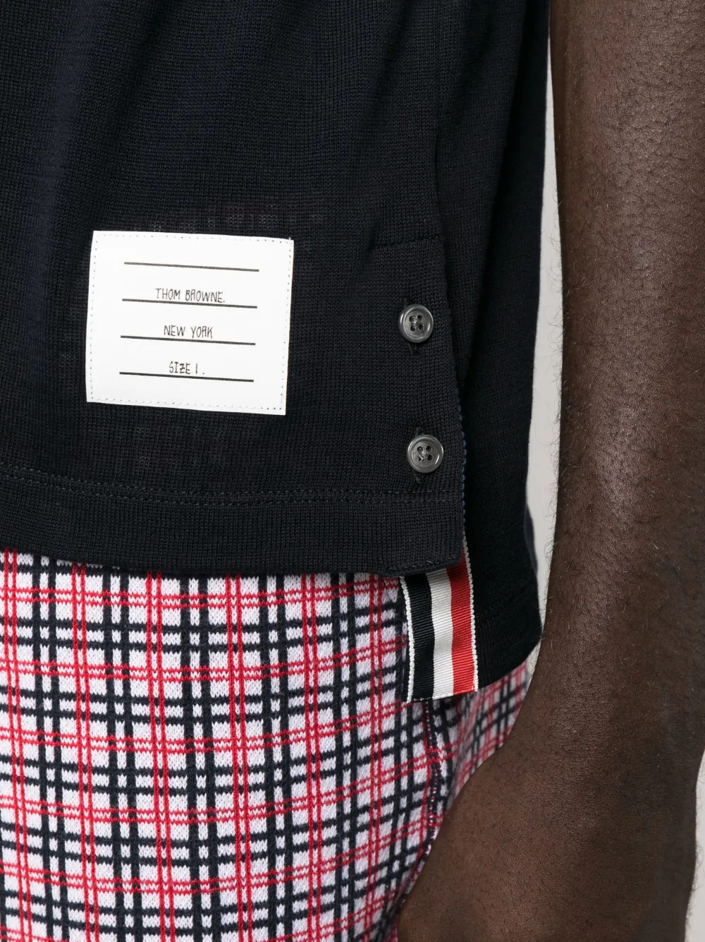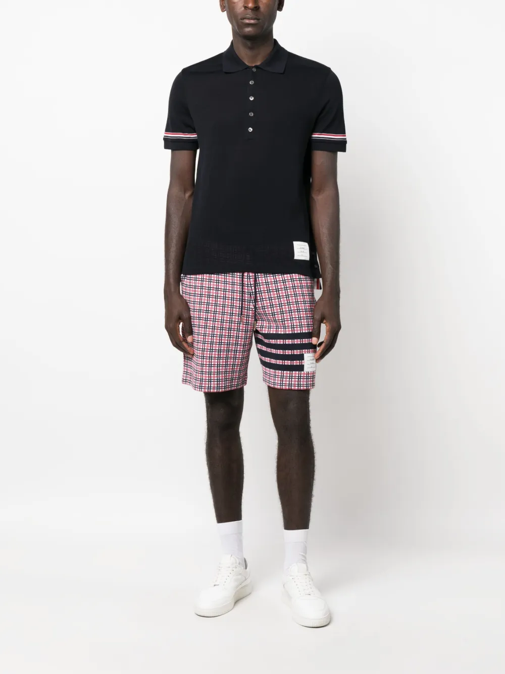 Темно-синий, ярко-красный, кремовый, хлопок, полоски RWB, нашивка с логотипом спереди, воротник поло, планка на пуговицах спереди, короткие рукава, манжеты в рубчик, прямой подол и боковые разрезы.