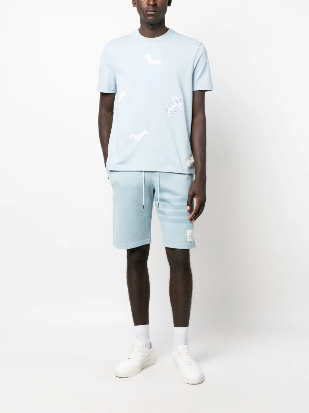 Голубой, хлопок, трикотаж с петлями на изнаночной стороне, полоски 4-Bar, полоски RWB, кулиска на талии, два прорезных кармана по бокам и прямой подол.