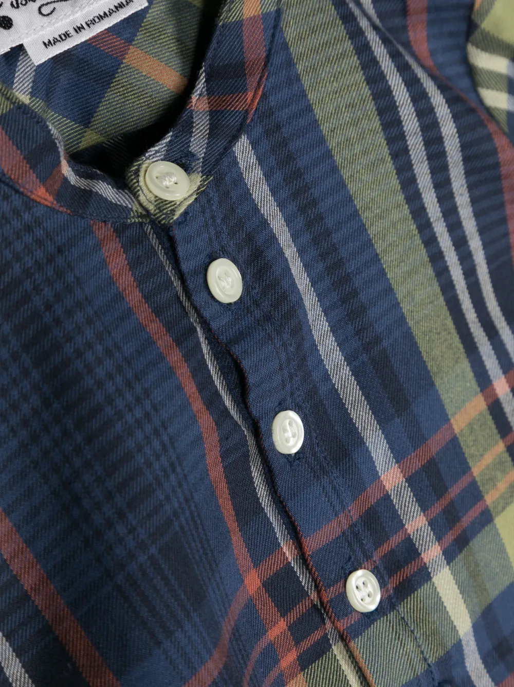 Темно-синий, разноцветный, клетчатый узор, без воротника, застежка на пуговицах спереди, длинные рукава, манжеты на пуговицах и прямой подол.