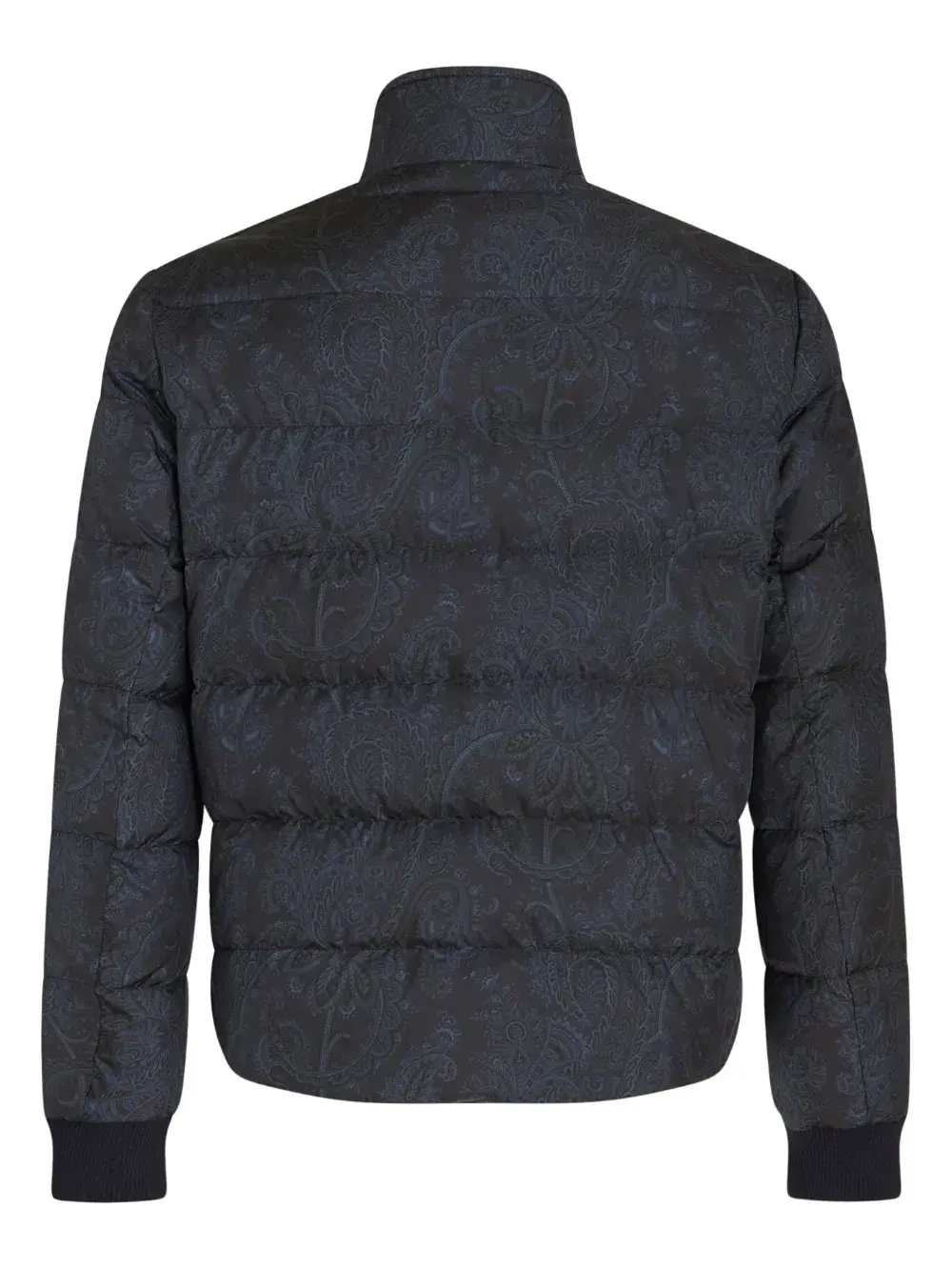 Темно-синий, дутый материал, принт пейсли, высокий воротник, застежка на молнии спереди, длинные рукава, рукава с узкими манжетами, два прорезных кармана по бокам и прямой подол.