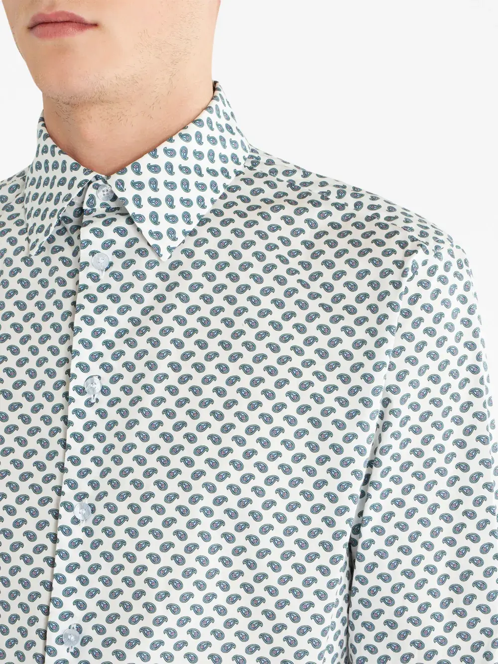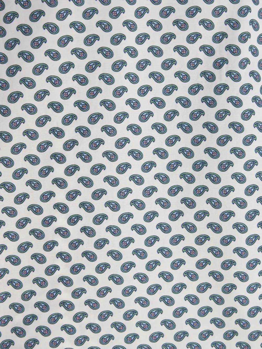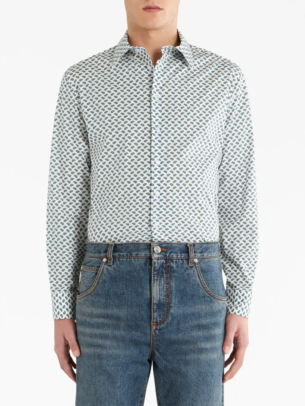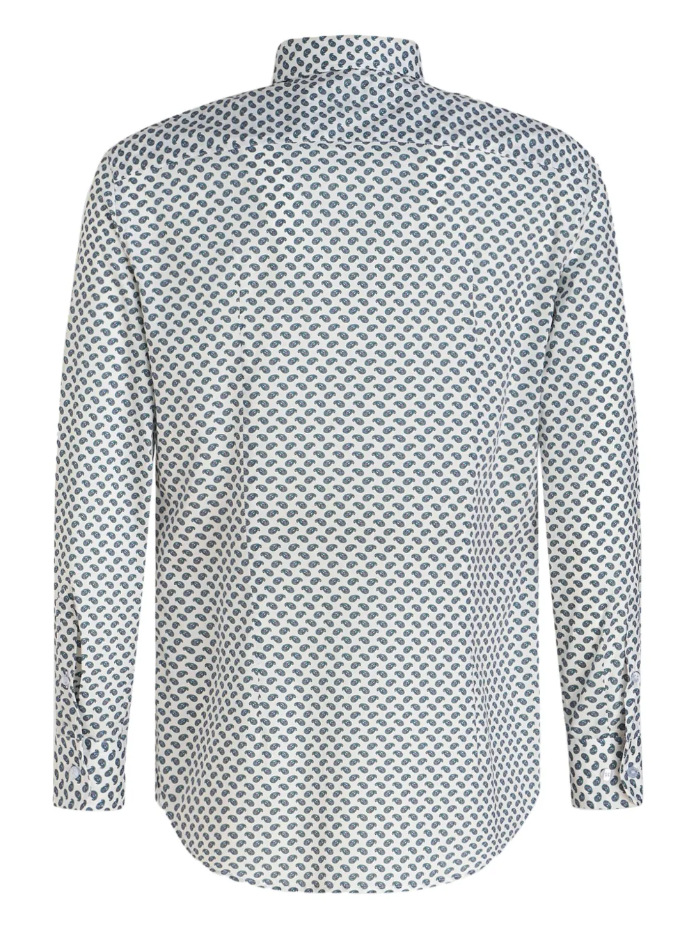 Голубой, эластичный хлопок, принт пейсли, классический воротник, застежка на пуговицах спереди, длинные рукава, манжеты на пуговицах и закругленный подол.