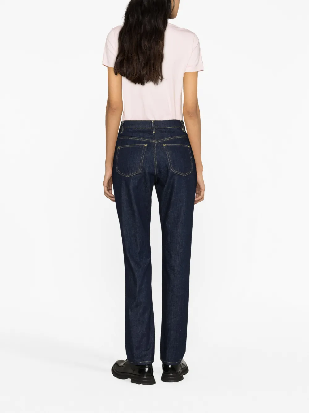 Индиго, хлопок, деним, контрастная строчка, средняя посадка, петли для ремня, ширинка на пуговицах, пять карманов, нашивка с логотипом сзади и прямой крой.