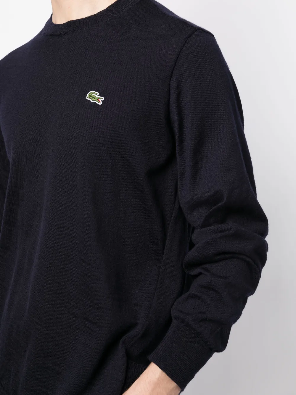 Темно-синий, шерсть, трикотажный материал, нашивка с логотипом на груди, круглый вырез и длинные рукава.
