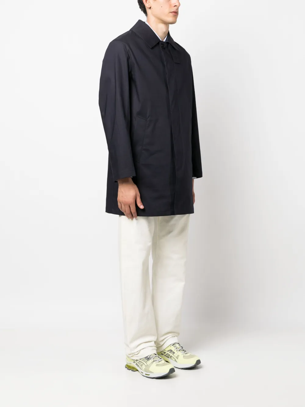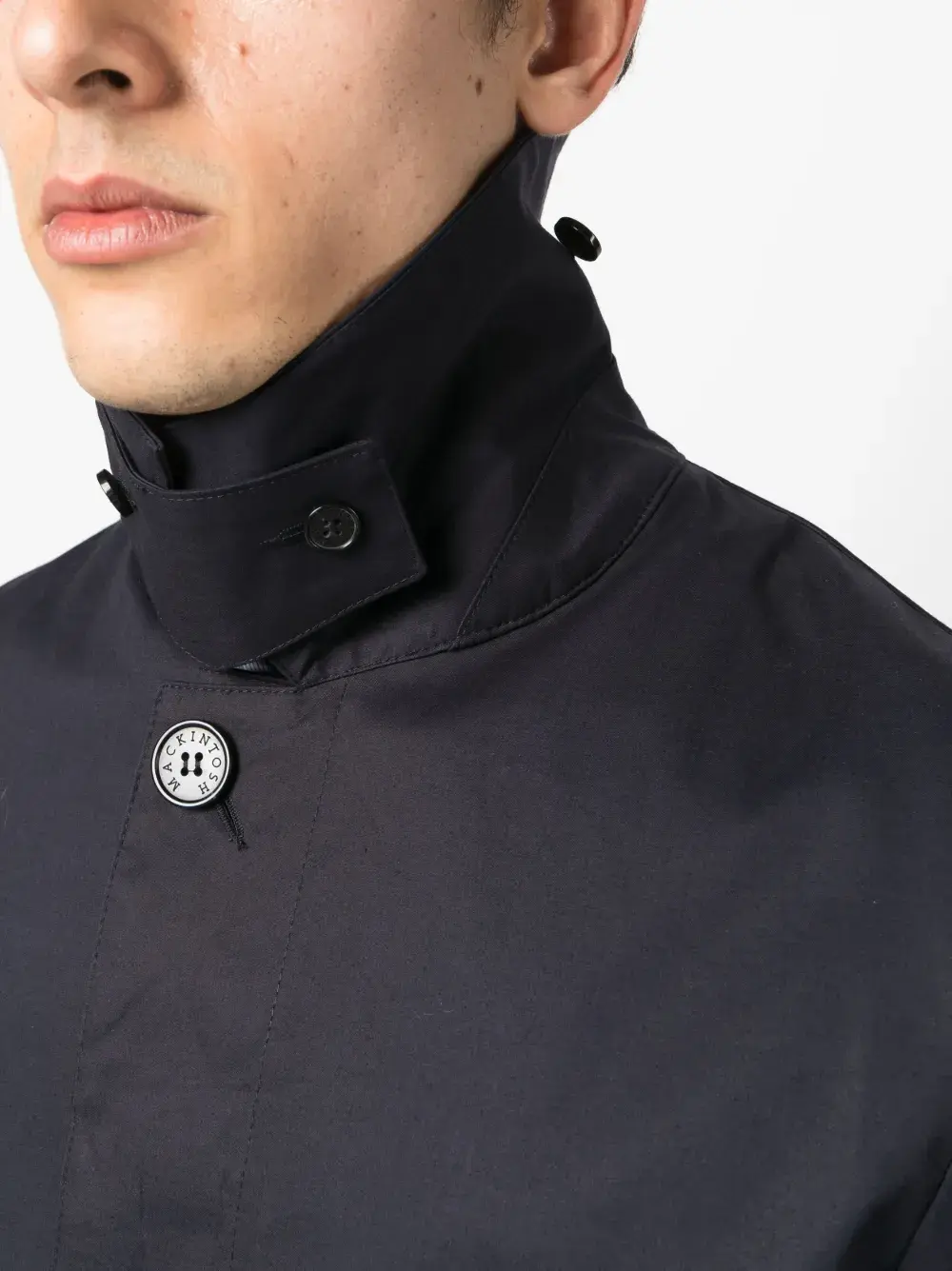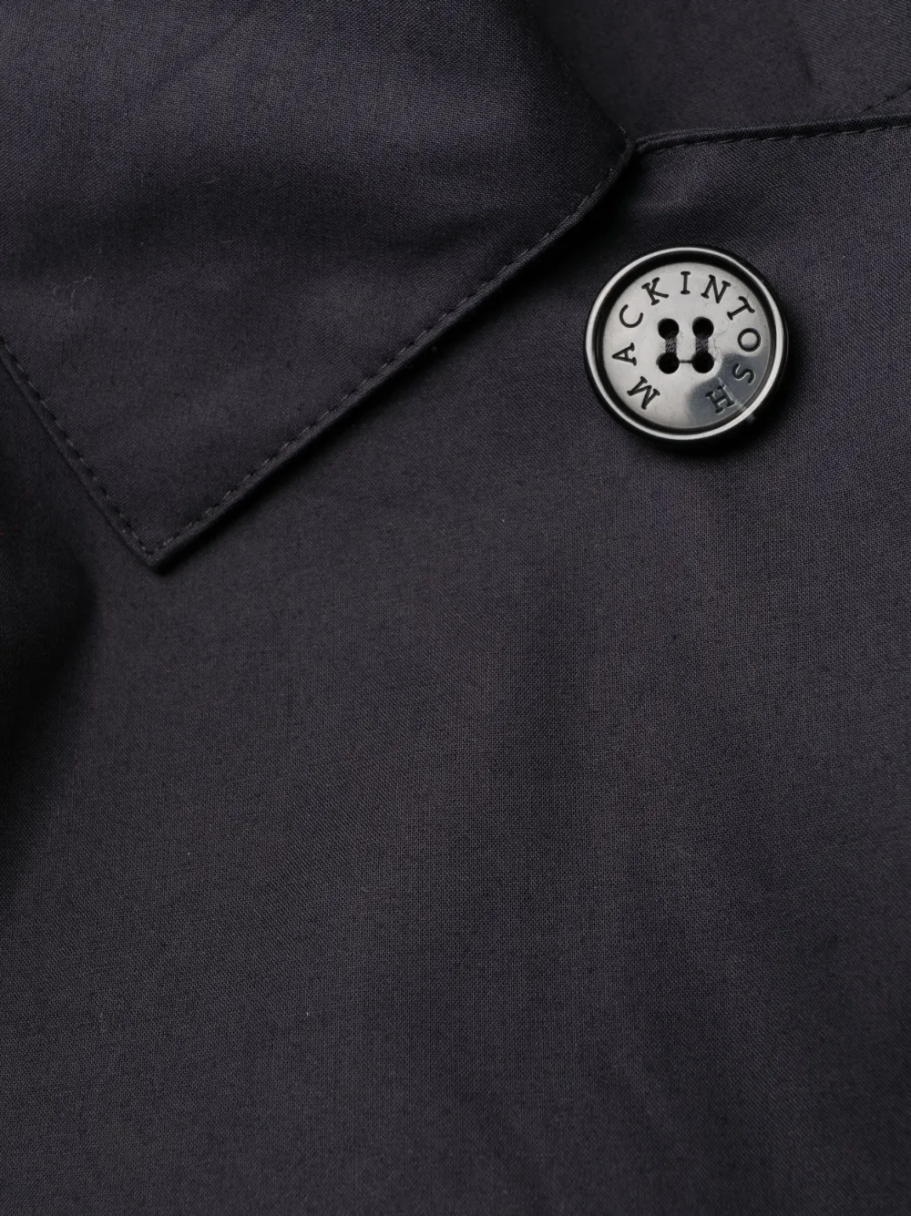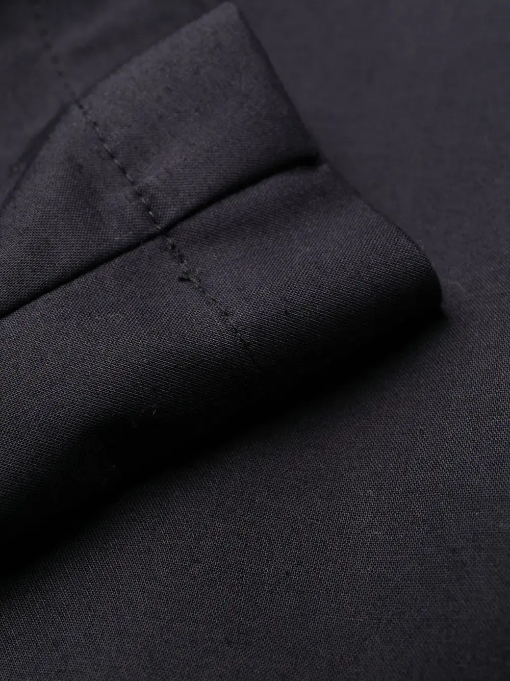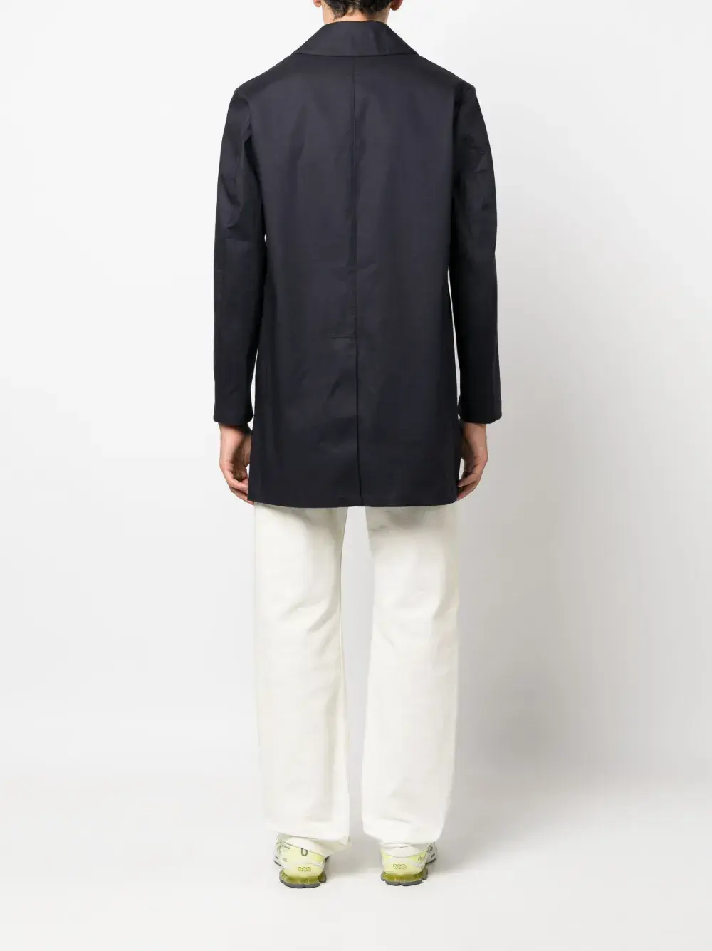 Темно-синий, хлопок, саржевое переплетение, отложной воротник, застежка на шее, потайная застежка спереди, длинные рукава, два боковых кармана с листочкой, прямой подол и длина до бедер.