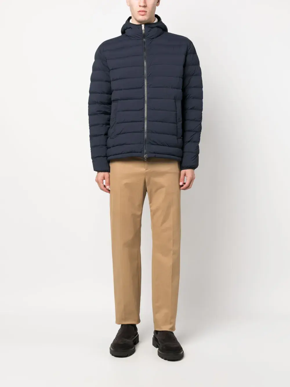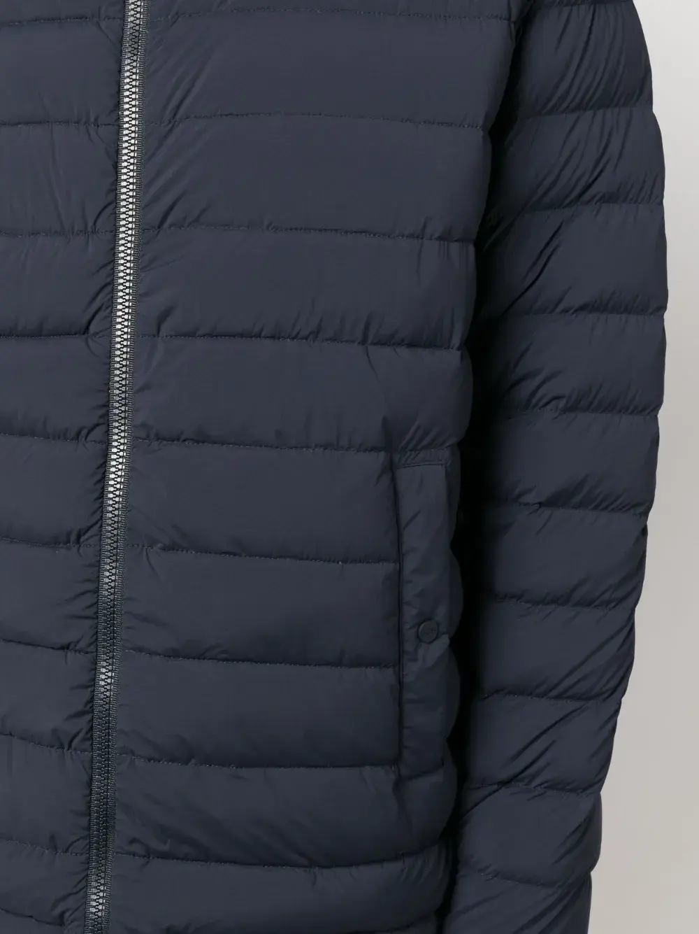 Темно-синий, гусиный пух, дутый материал, классический капюшон, двусторонняя молния спереди, длинные рукава, два прорезных кармана сбоку и прямой подол.
