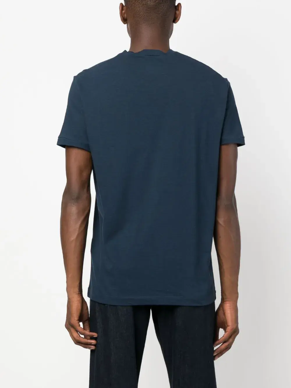 Темно-синий, хлопок, логотип спереди, круглый вырез, короткие рукава и прямой подол.
