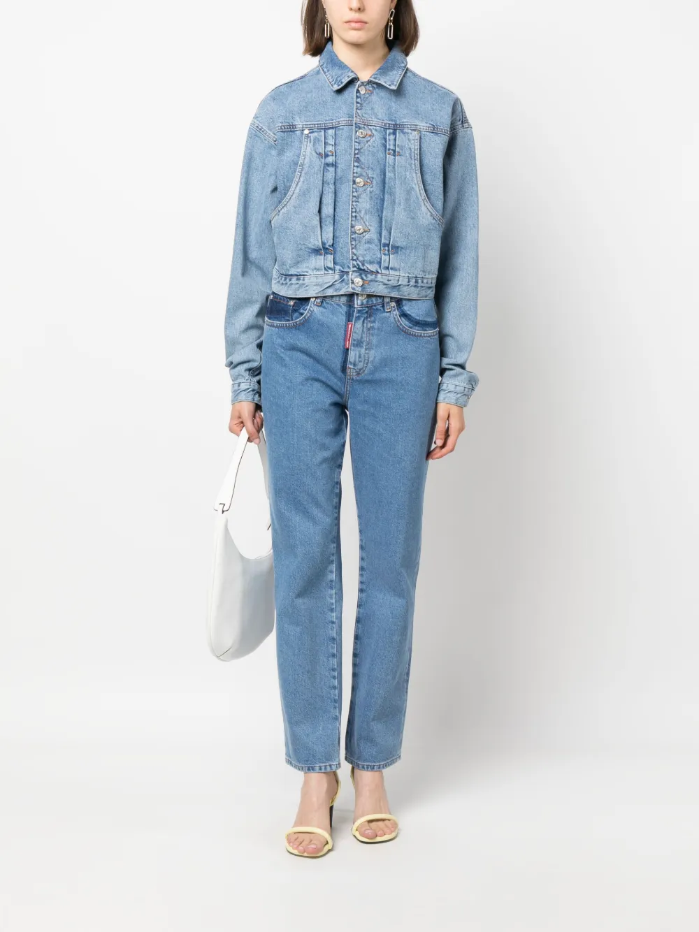 Синий, хлопок, сочетание двух оттенков, нашивка с логотипом на язычке, пять карманов и прямой крой.