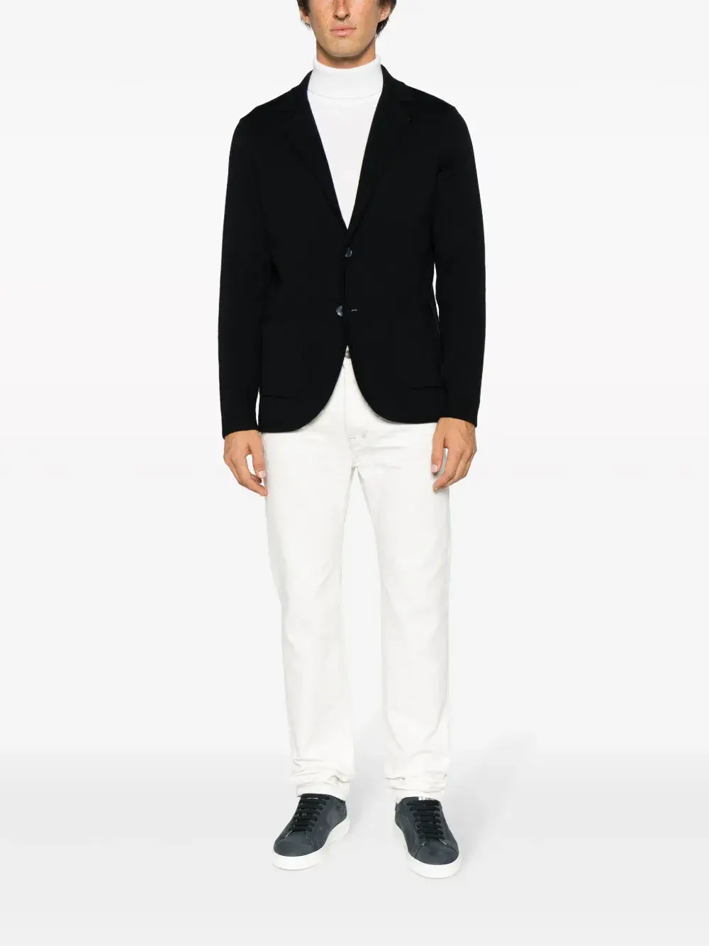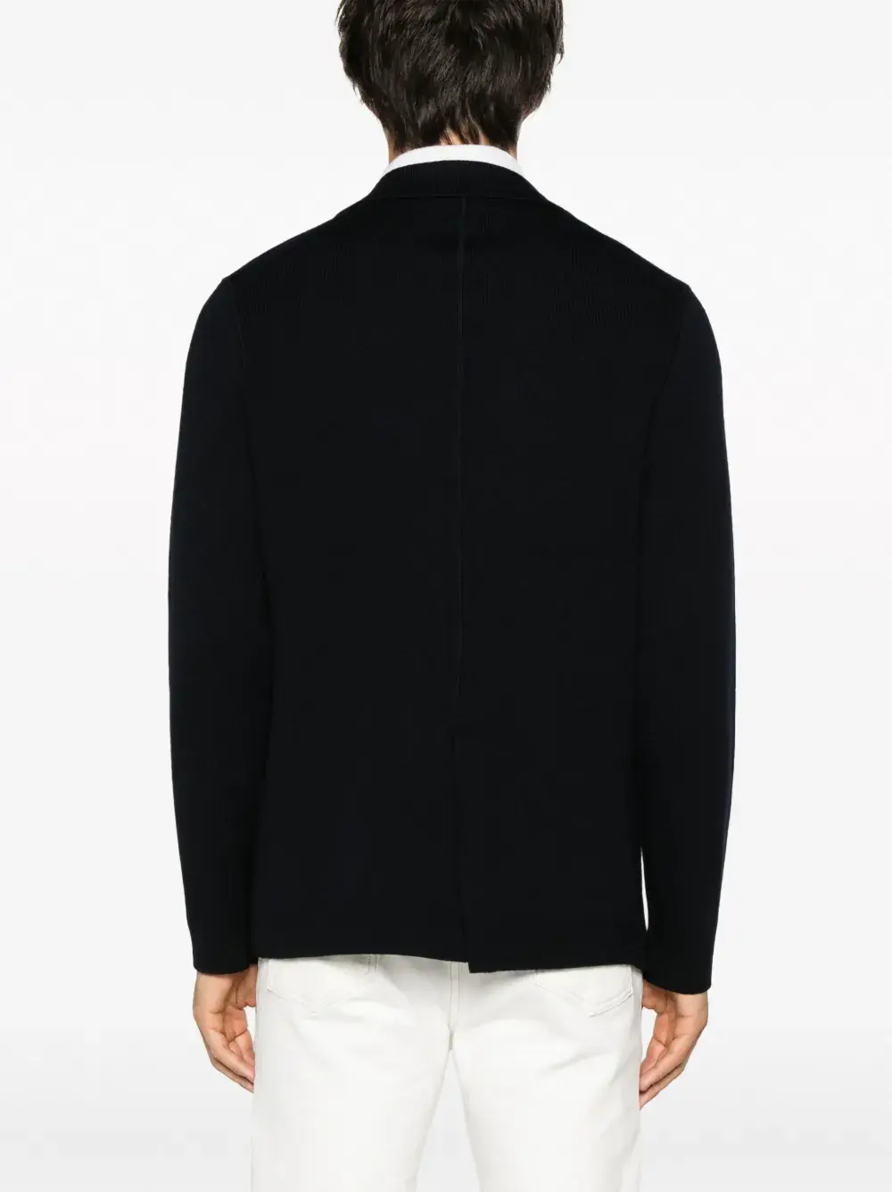Темно-синий, шерсть мериноса, трикотажный материал, зазубренные лацканы, застежка на пуговицах спереди, длинные рукава, два накладных кармана по бокам и шлица по центру сзади.