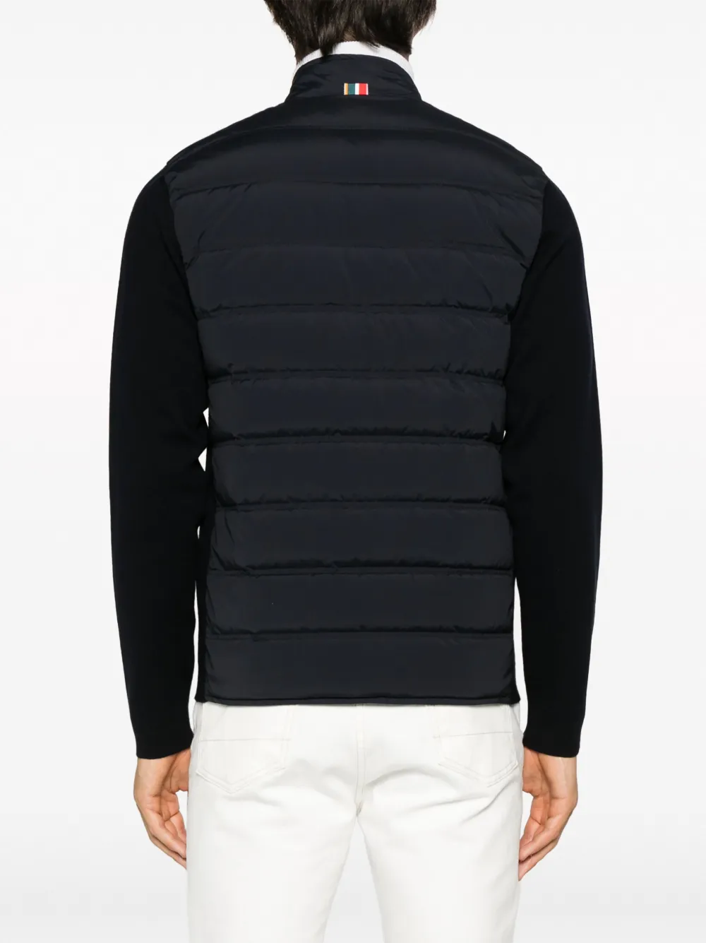 Темно-синий, шерсть мериноса, гусиный пух, вставки, дутые вставки, воротник-труба, двусторонняя молния спереди, длинные рукава, два кармана на молнии по бокам и прямой подол.