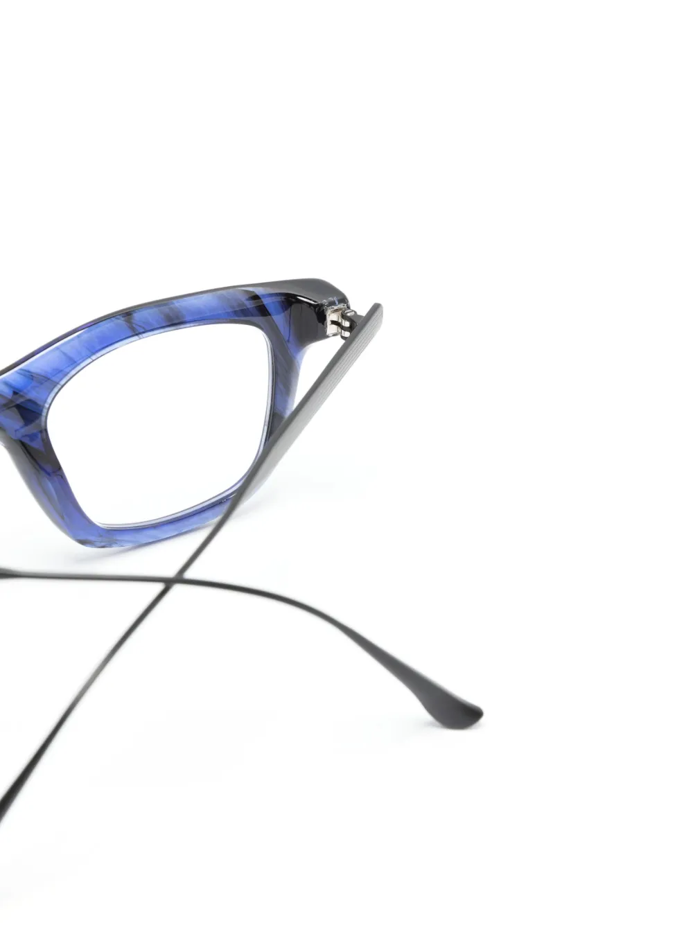 Ирисовый синий, черный, ацетат, матовый эффект, прозрачные линзы, квадратная оправа, матовое покрытие и прямые дужки. Обратите внимание, что на FARFETCH продаются оправы с линзами без диоптрий. В комплект входит защитный чехол для очков.