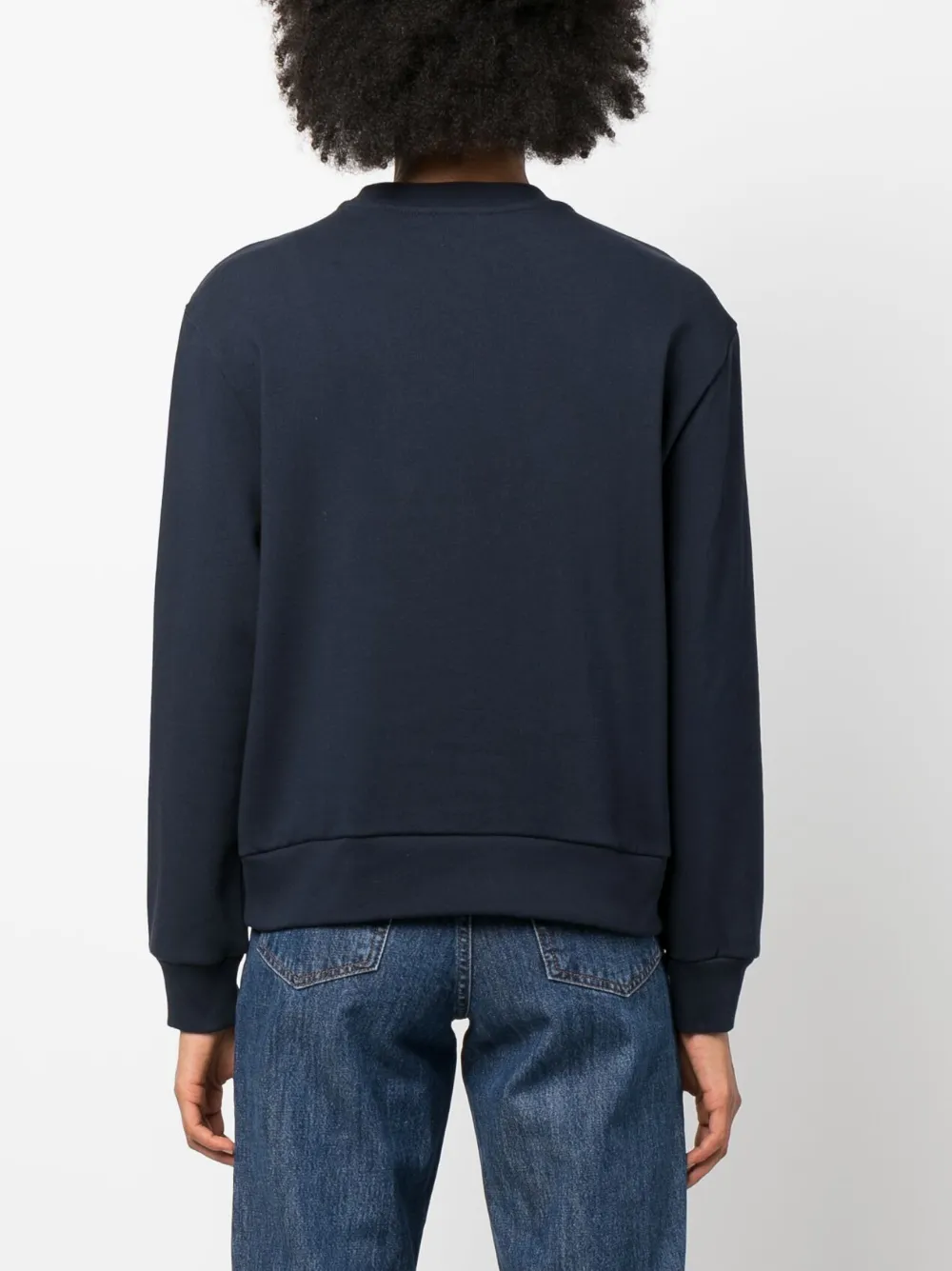 Темно-синий, хлопок, принт с логотипом на груди, круглый вырез, длинные рукава и прямой подол.
