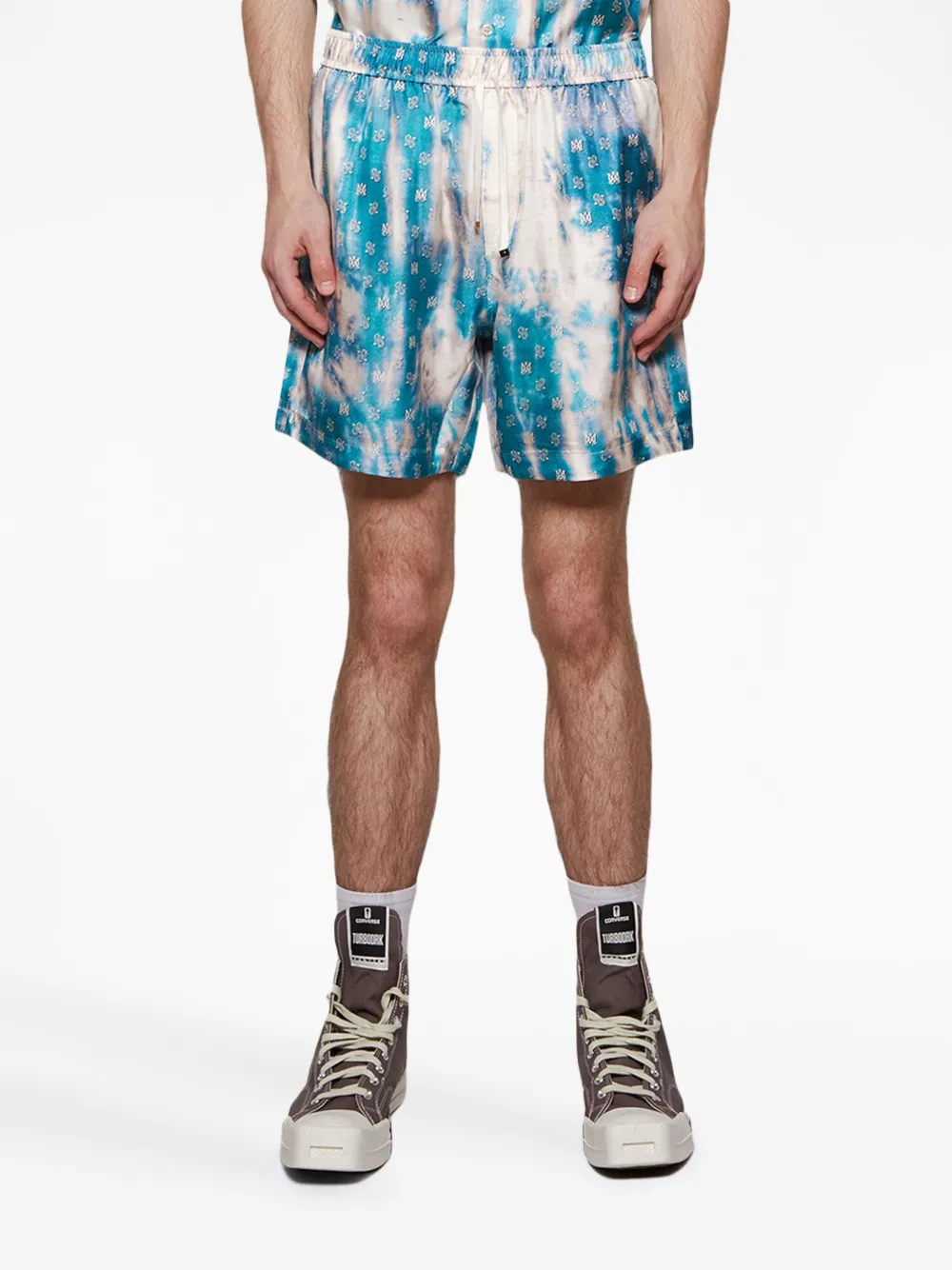 Сине-зеленый, кремовый, шелк, эффект обесцвечивания, монограмма, кулиска на талии и длина выше колена.