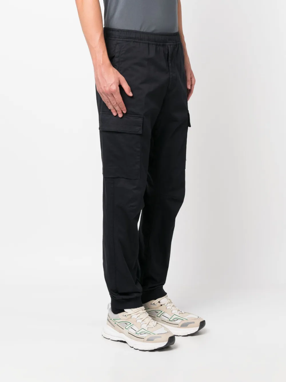Темно-синий, смесь хлопка и шерсти, знаковая деталь в виде компаса, нашивка с логотипом сбоку, средняя посадка, эластичный пояс, два кармана на молнии по бокам, два накладных кармана по бокам, задние карманы с листочкой и эластичные манжеты.