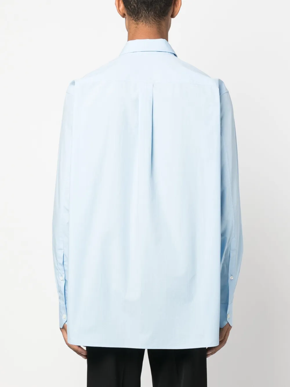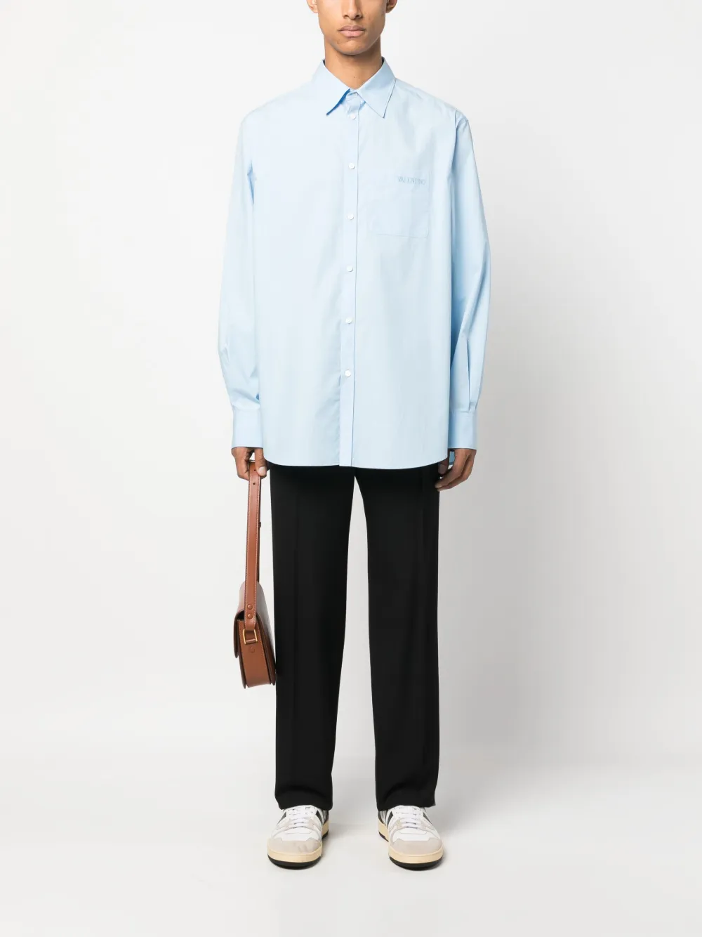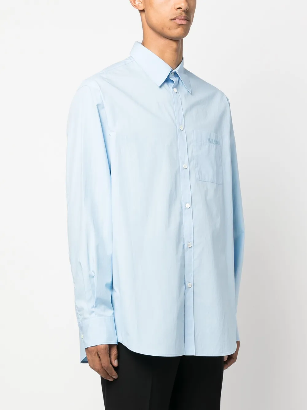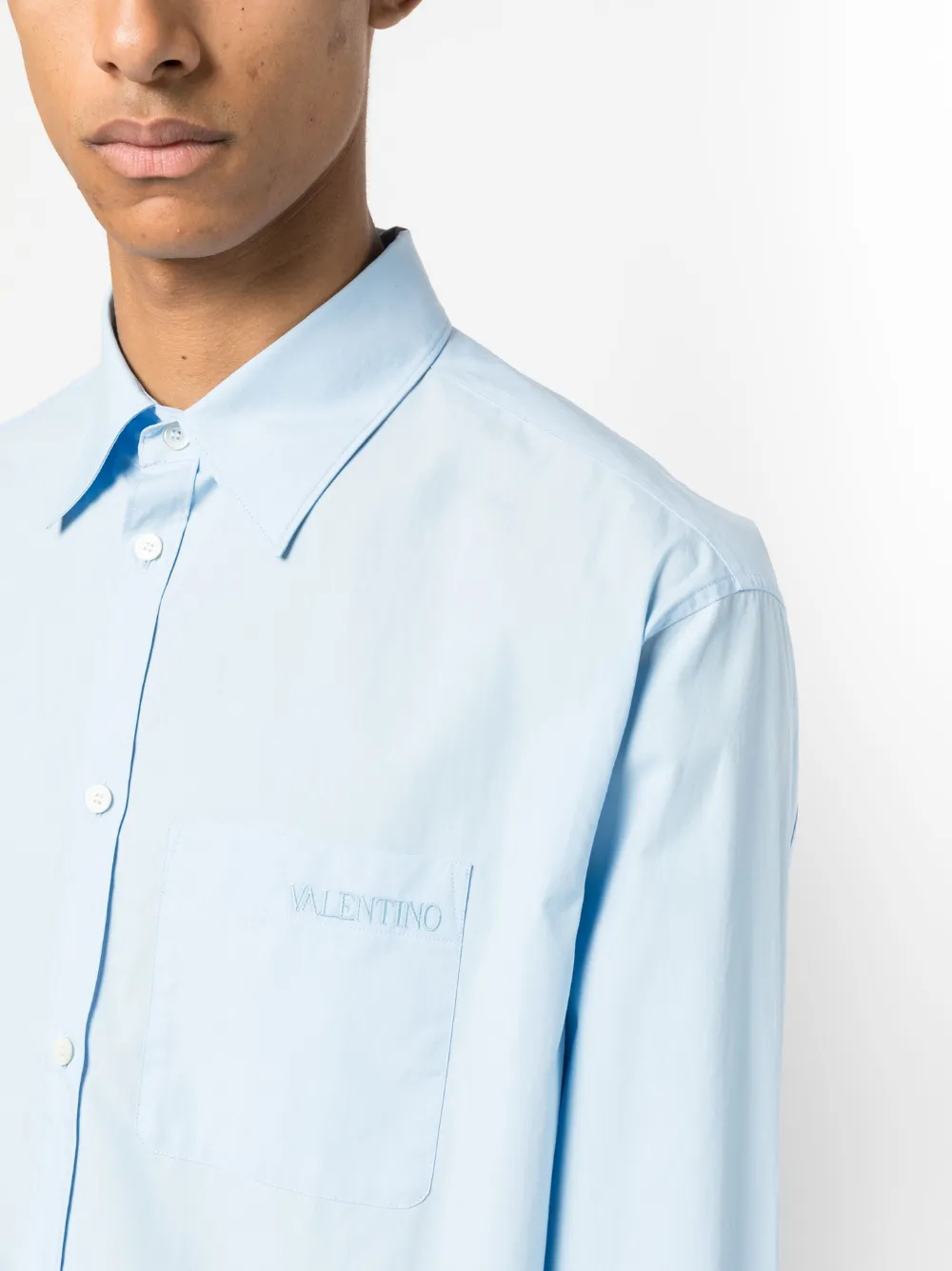 Коллекция Valentino Ready To Wear, голубой, хлопок, вышитый логотип на груди, классический воротник, шнуровка спереди, длинные рукава и нагрудный накладной карман.