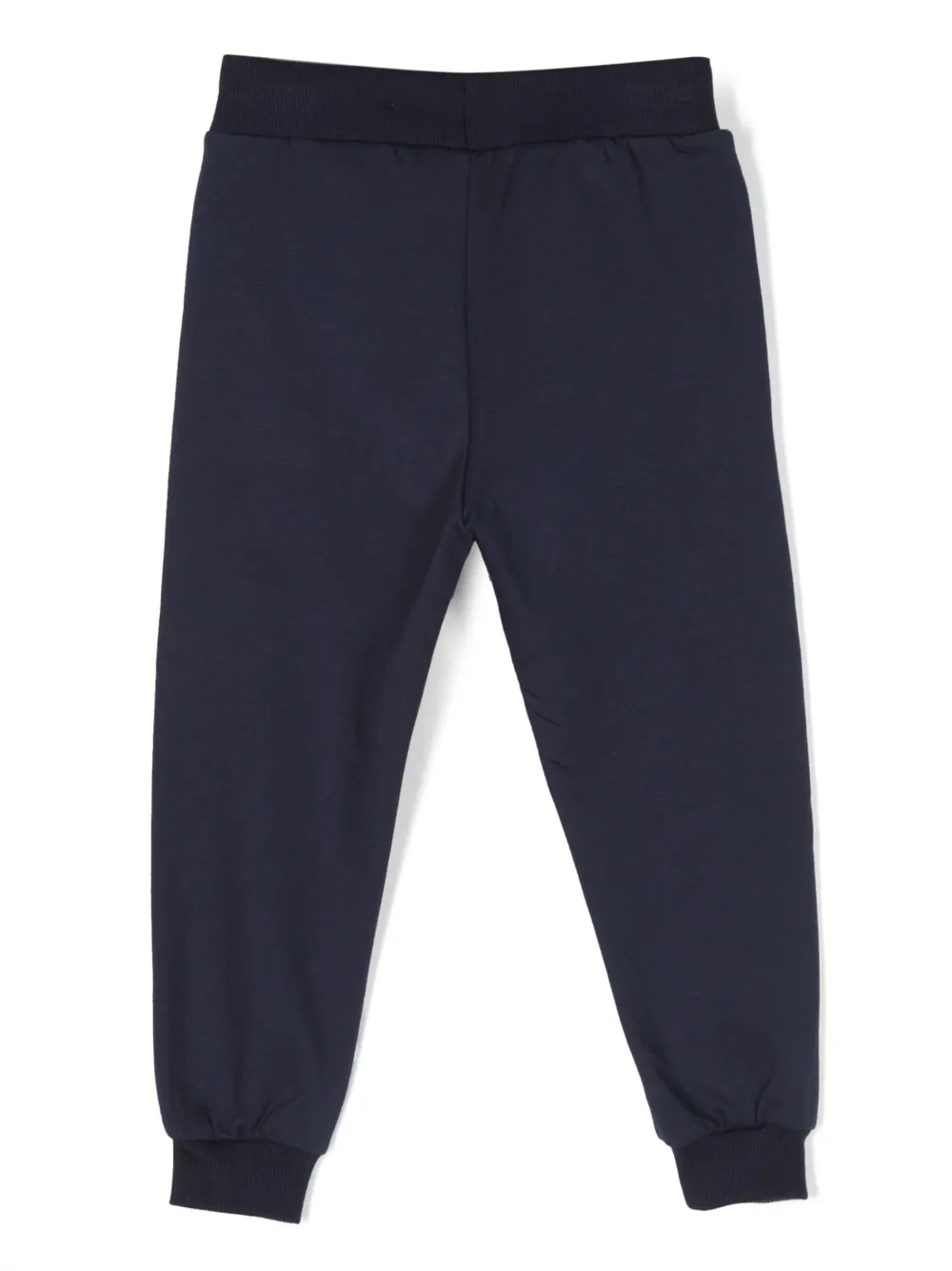 Темно-синий, эластичный хлопок, принт с логотипом, эластичный пояс и эластичные манжеты.