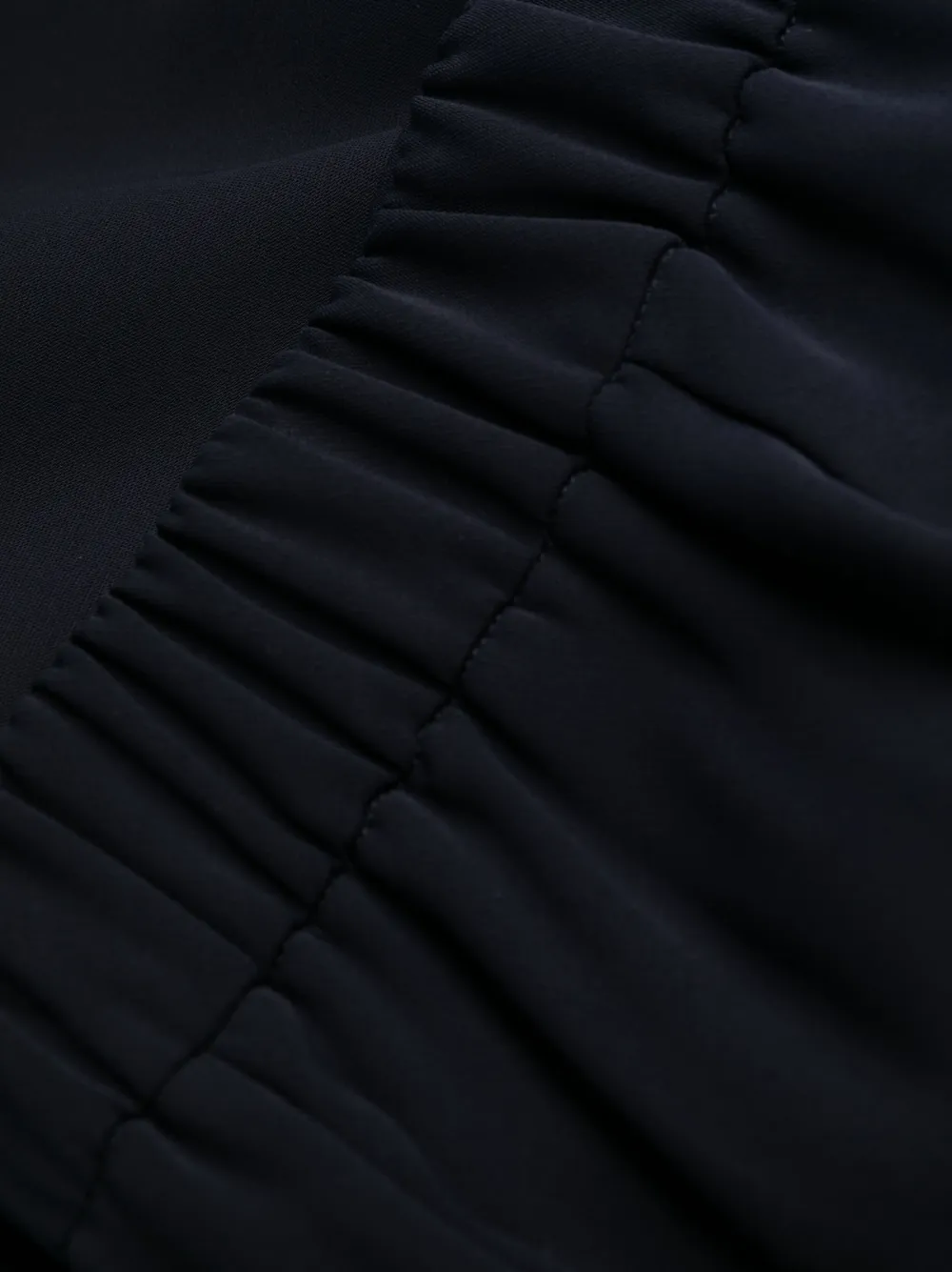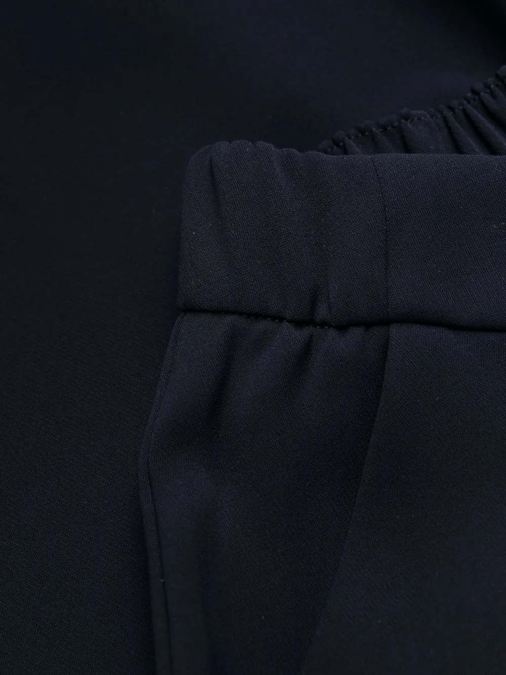 Темно-синий, прямой крой, эластичный пояс сзади и два прорезных кармана по бокам.