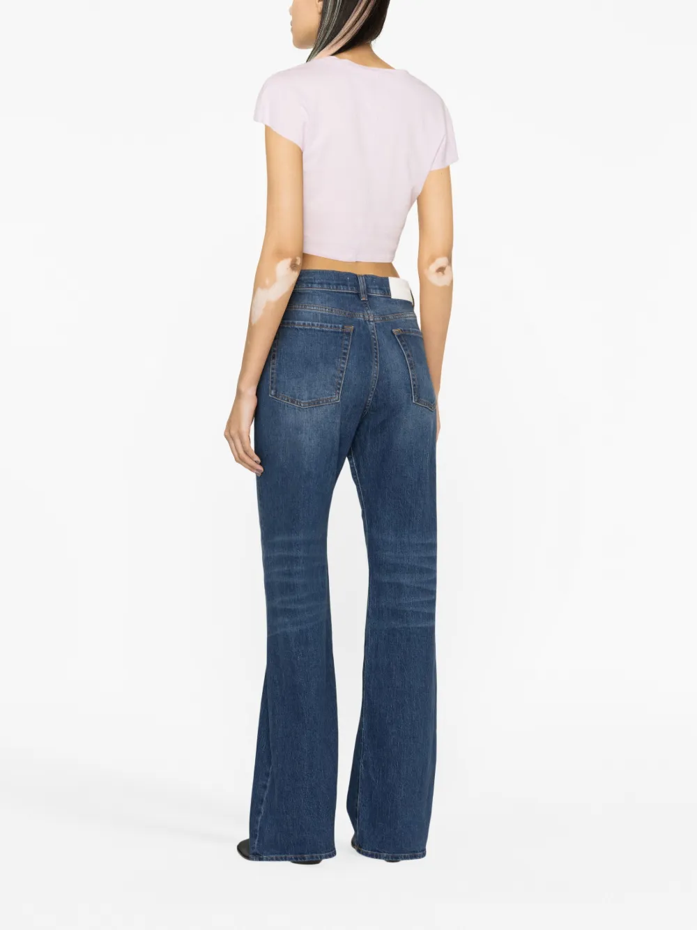 Индиго, смесовый хлопок, деним, потайная застежка на молнии и пуговицах, пять карманов, широкий крой и прямой подол.