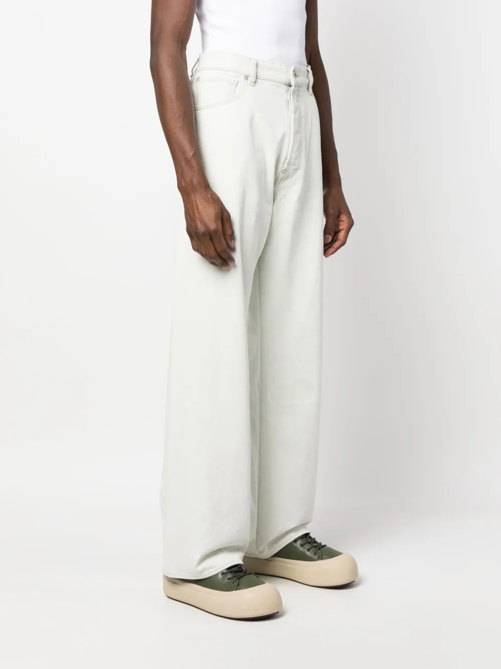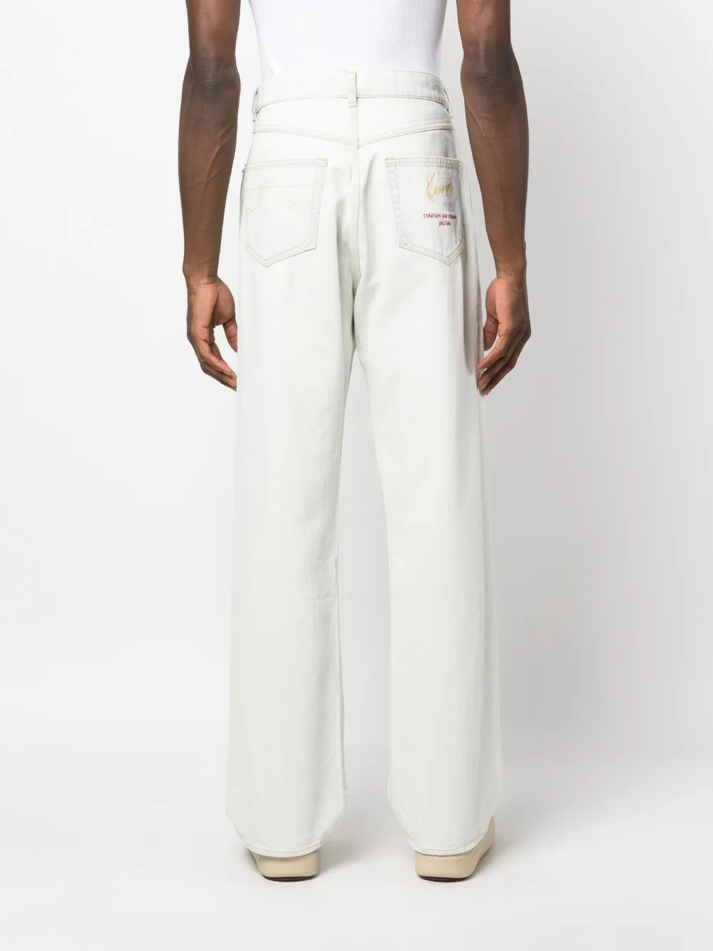 Голубой, эффект кислотной стирки, хлопок, средняя посадка, петли для ремня, потайная застежка на молнии и пуговицах, пять карманов, вышитый логотип сзади и прямой крой.