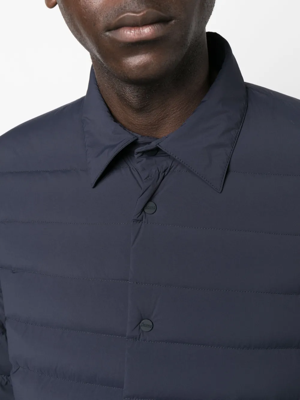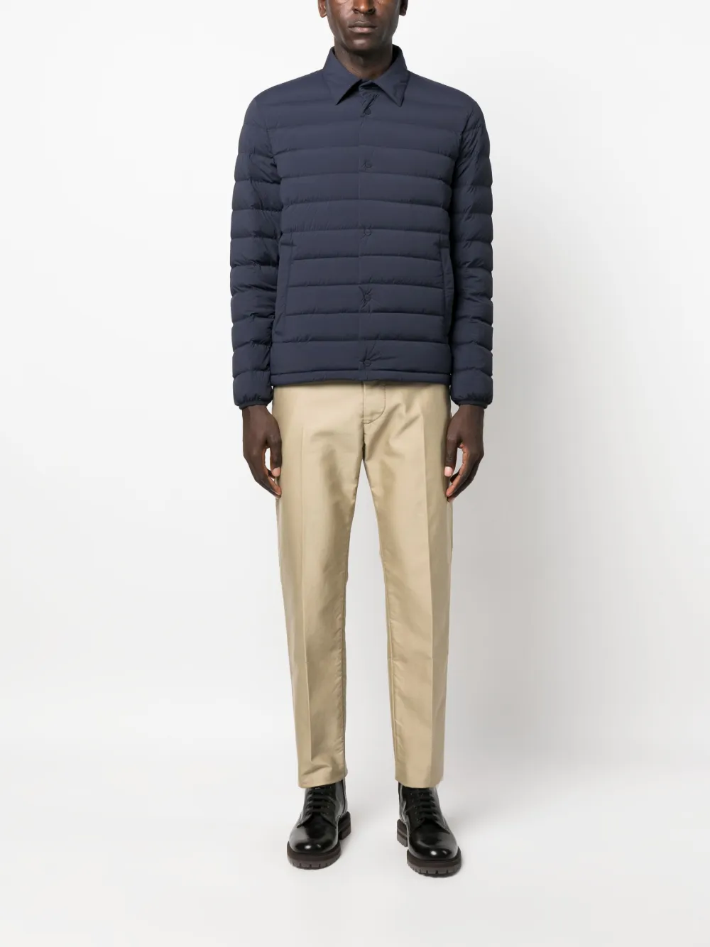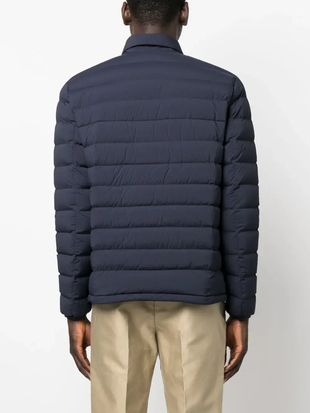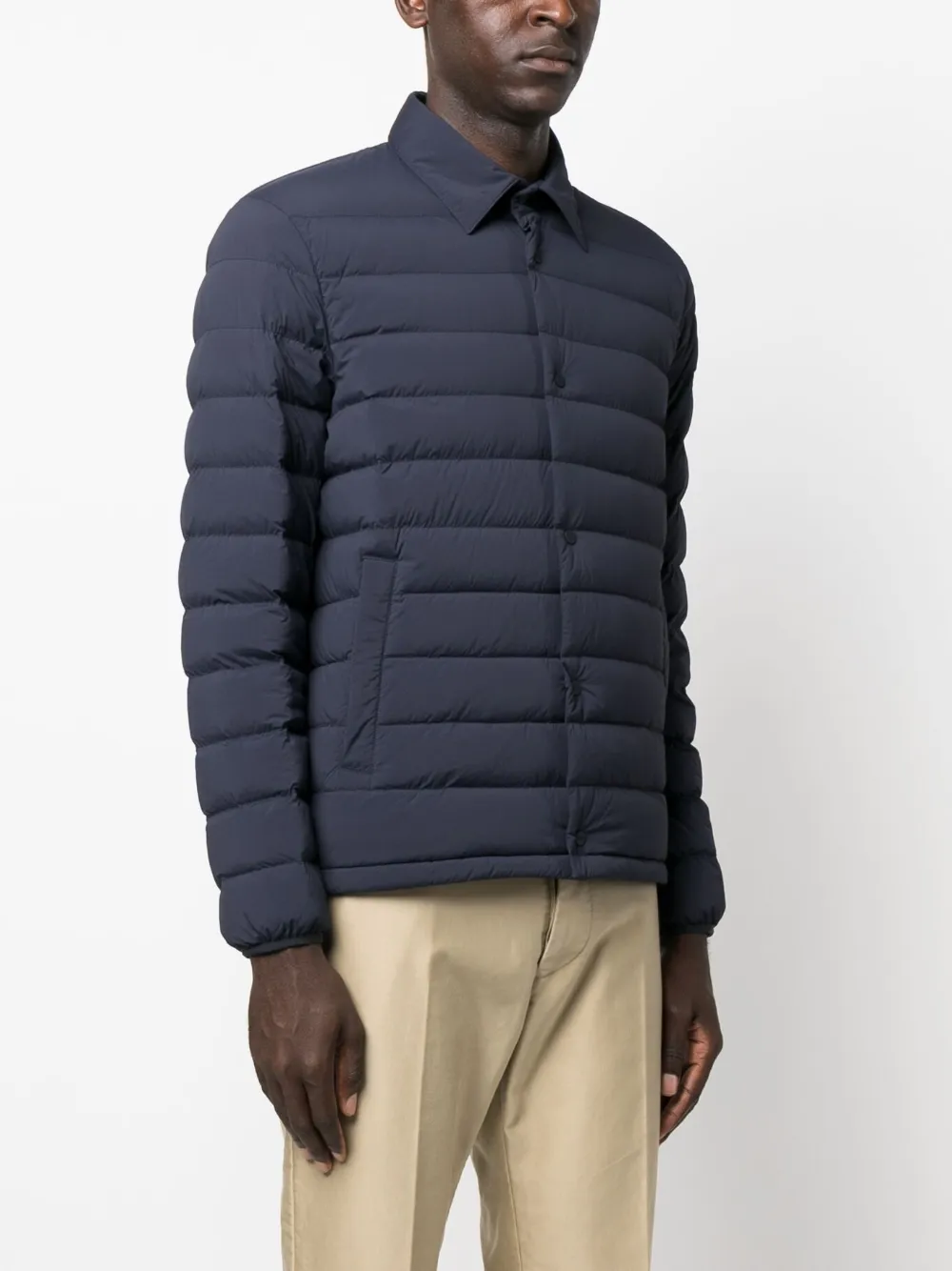 Темно-синий, наполнитель из смеси пуха и пера, дутый материал, классический воротник, застежка на кнопках спереди, длинные рукава, два прорезных кармана сбоку и прямой подол.
