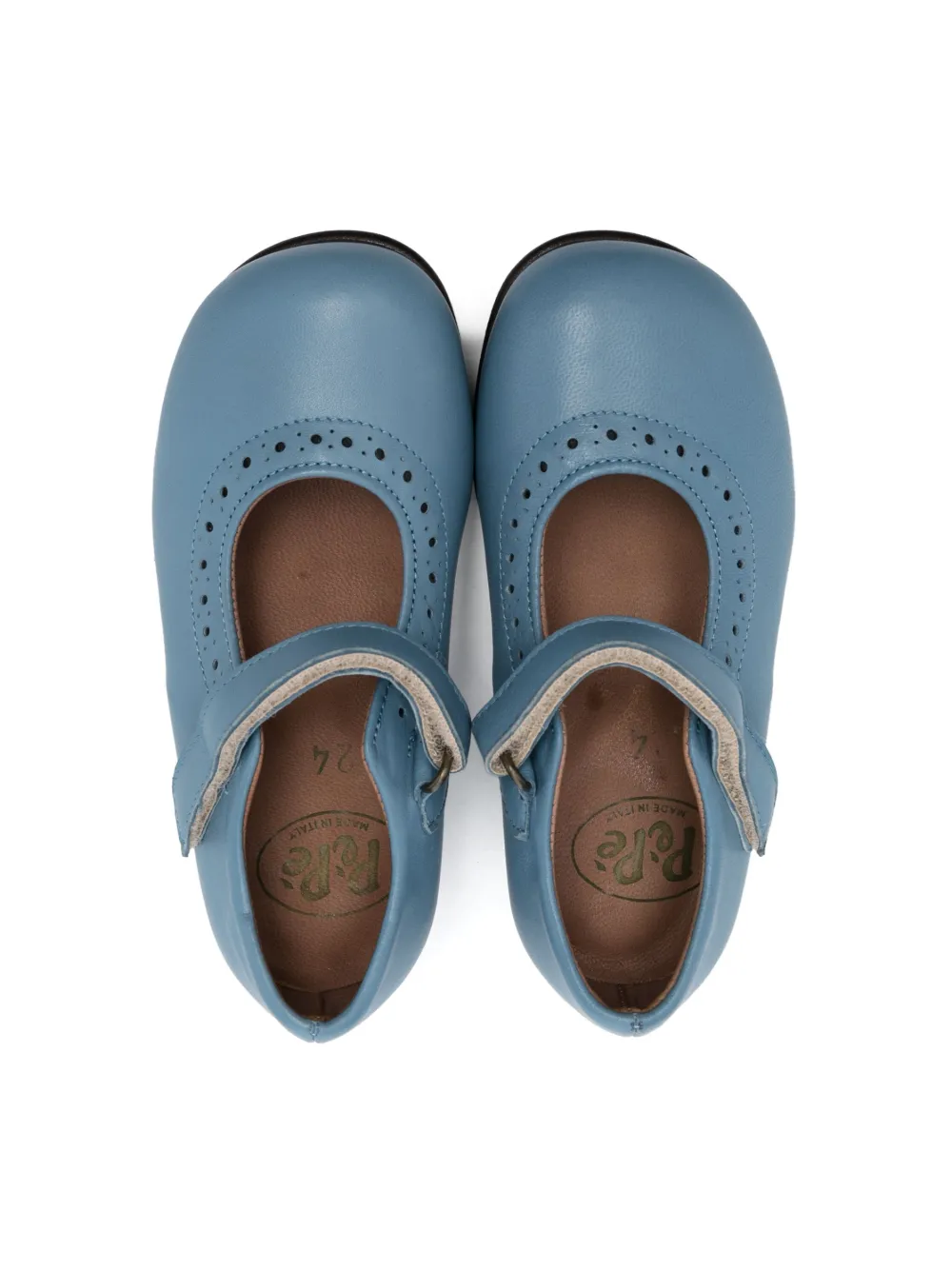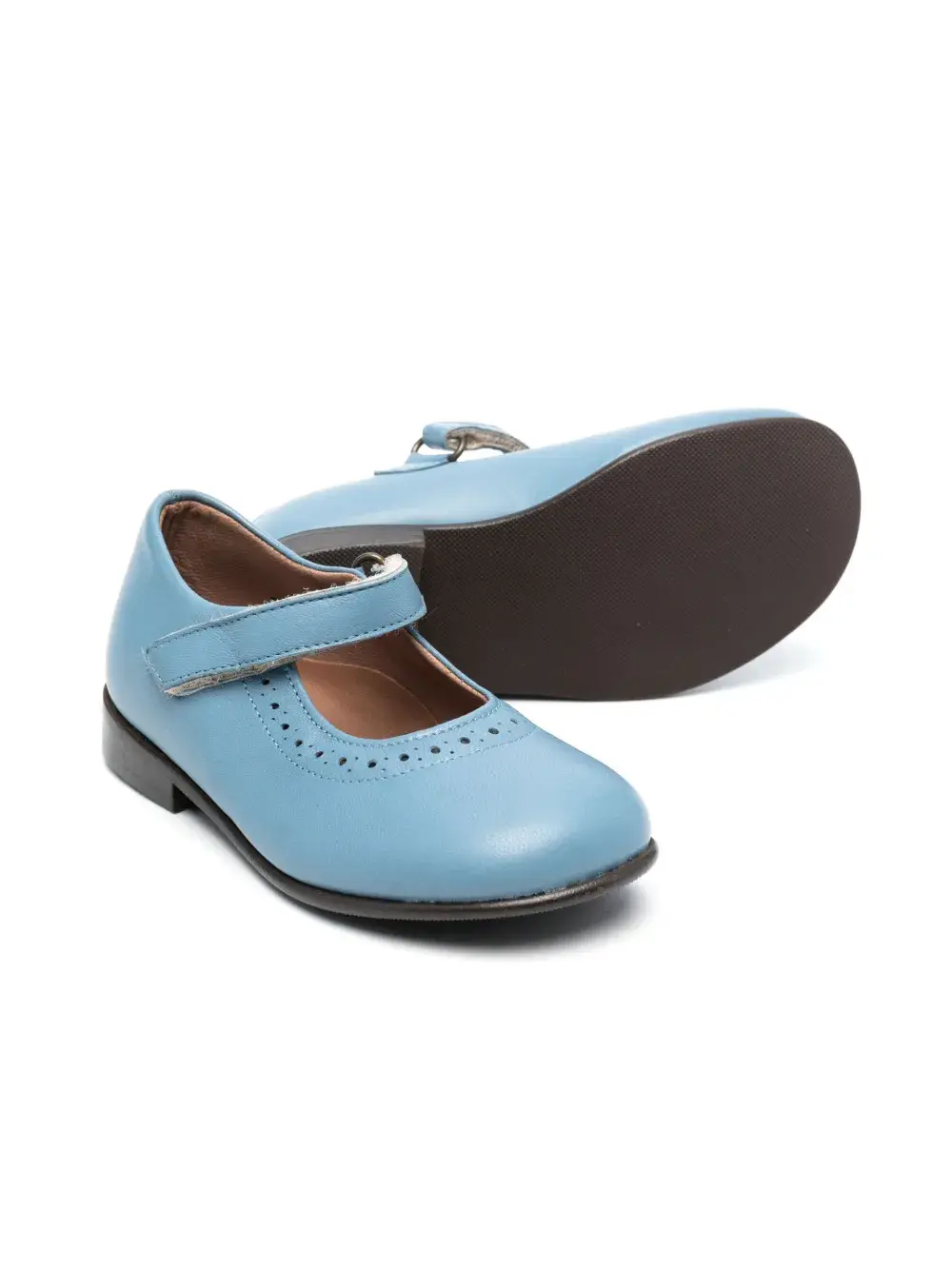 Синий, телячья кожа, козья кожа, перфорация, закругленный носок, застежка на липучке сбоку, стелька с логотипом, кожаная подкладка и плоская подошва.