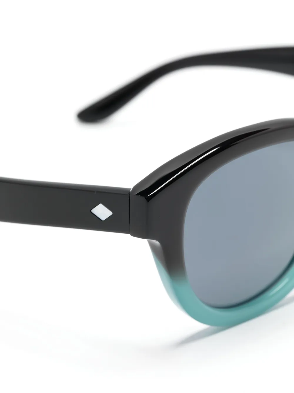 Черный, бирюзовый, ацетат, градиентный эффект, синие линзы, круглая оправа, прямые дужки и дужки с закругленными концами. В комплект входит защитный чехол для очков.