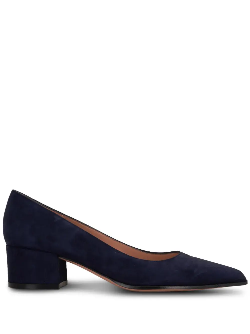 Темно-синий, замша, телячья кожа, заостренный носок, модель без застежки, кожаная стелька с логотипом, низкий блочный каблук и кожаная подошва.