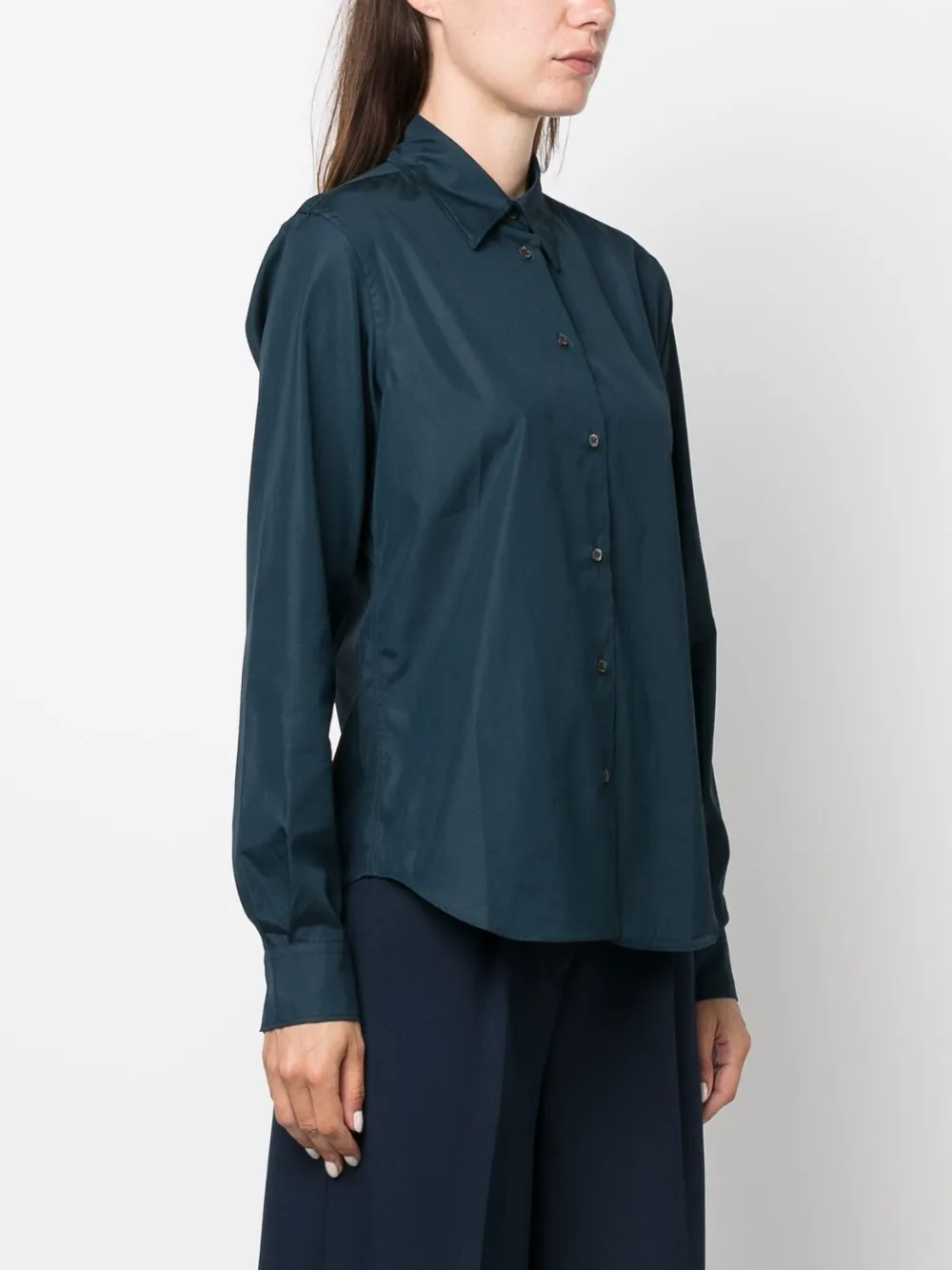 Темно-синий, хлопок, поплин, манжеты на пуговицах, отложной воротник, застежка на пуговицах спереди, длинные рукава и закругленный подол.