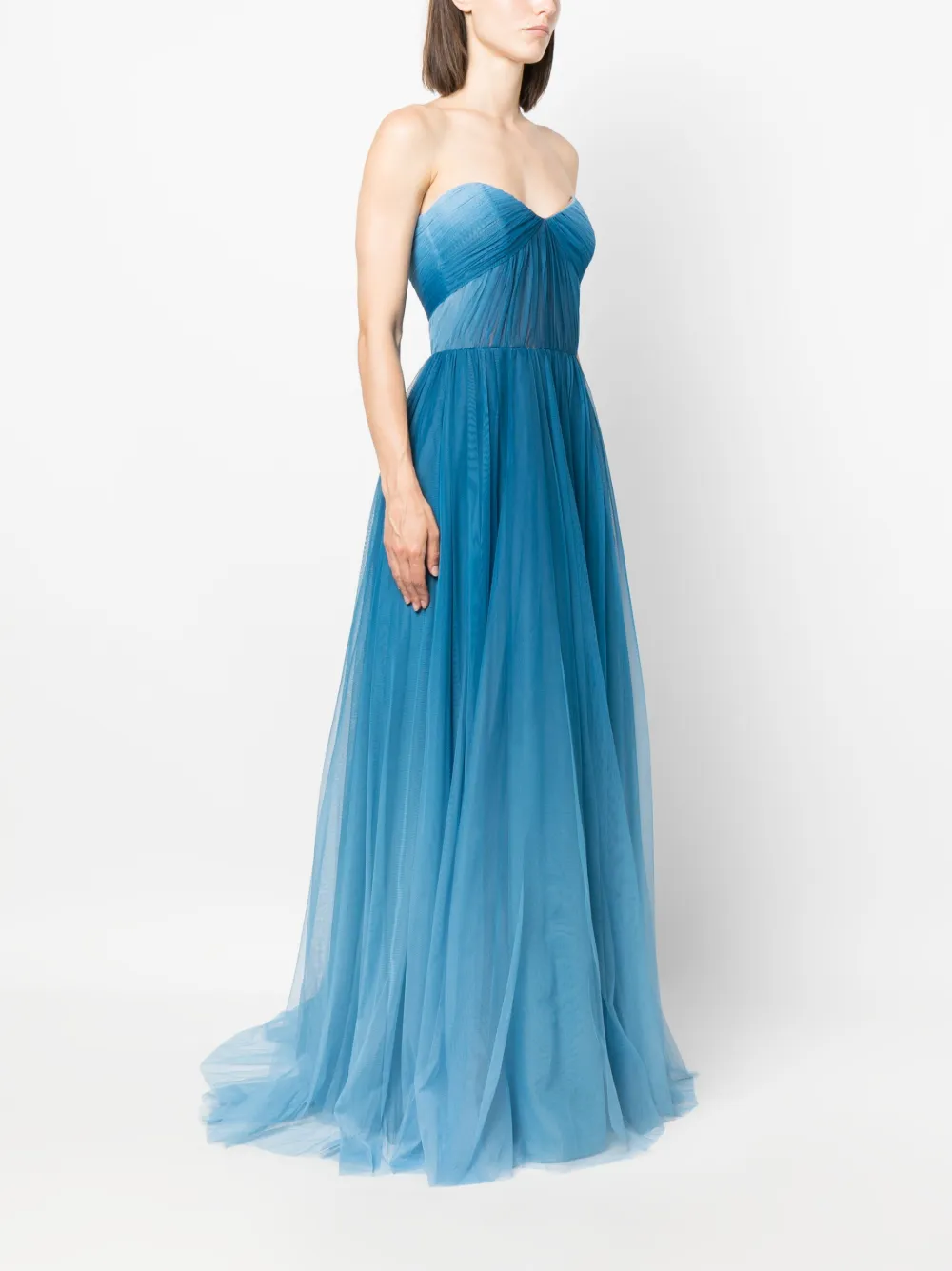 Сине-зеленый, градиентный эффект, вырез в форме сердца, без бретелей, ремень на талии, шнуровка сзади, органза, пышная юбка и длина макси.