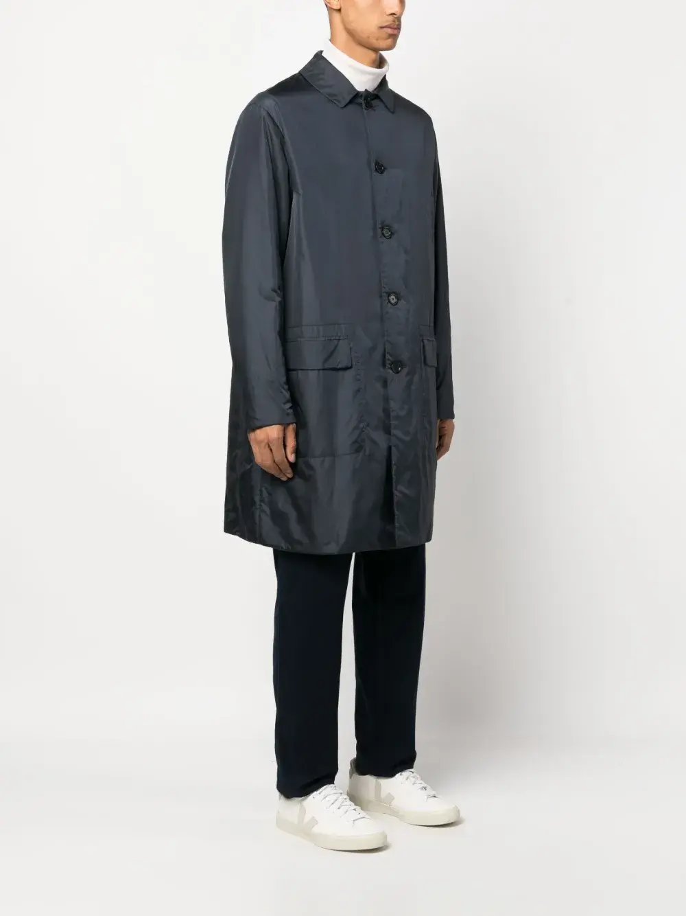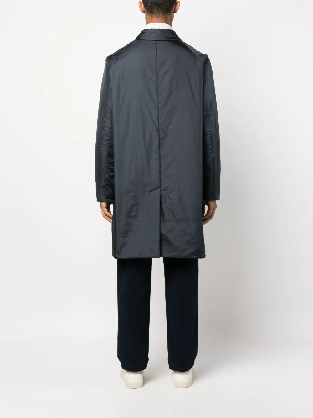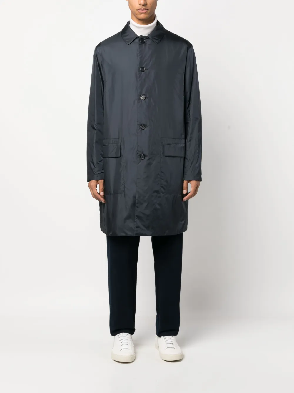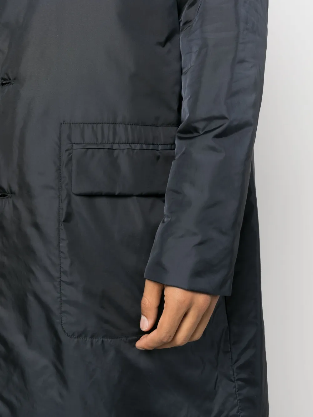 Темно-синий, дутый материал, отложной воротник, застежка на пуговицах спереди, длинные рукава, передние карманы с клапаном и длинная модель.
