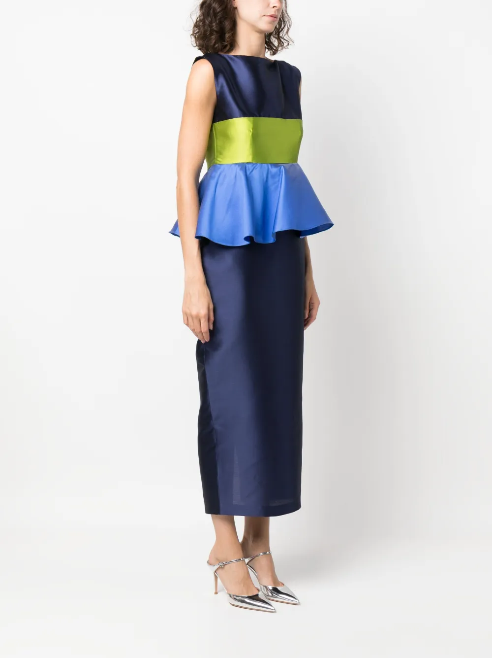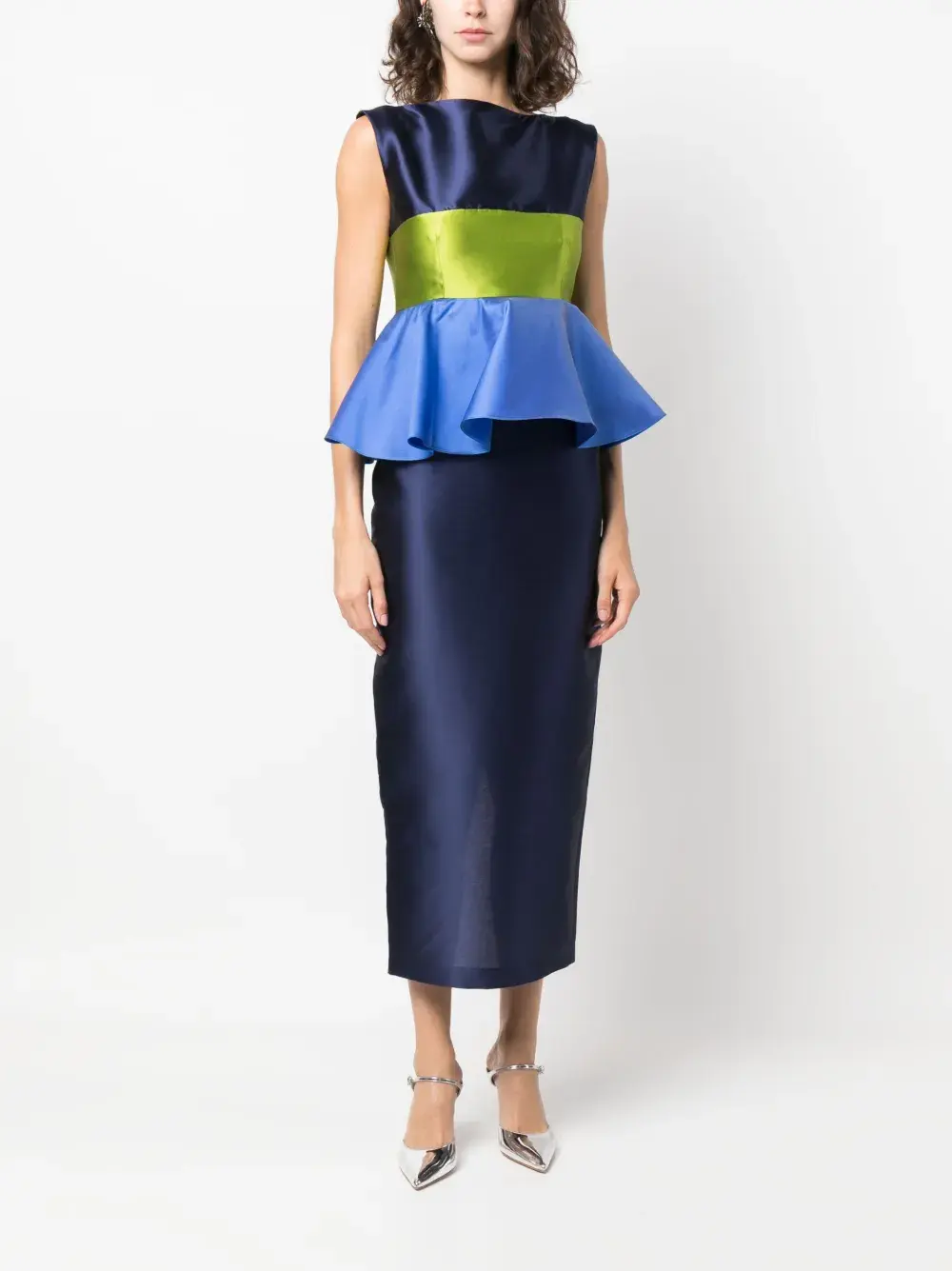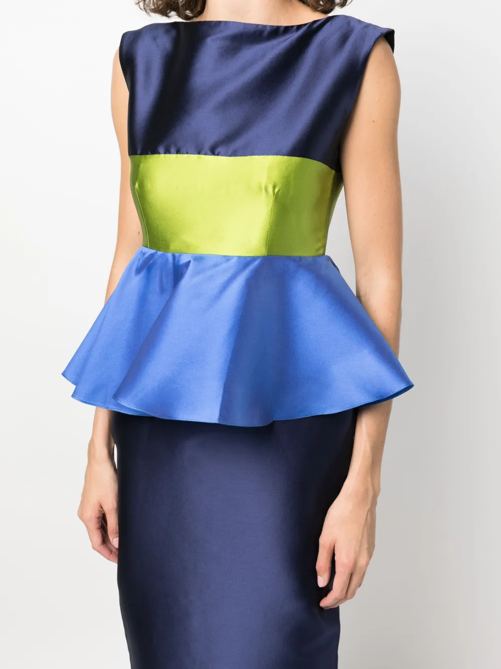 Стиль колор-блок, вырез сзади, баска и потайная застежка на молнии сзади.