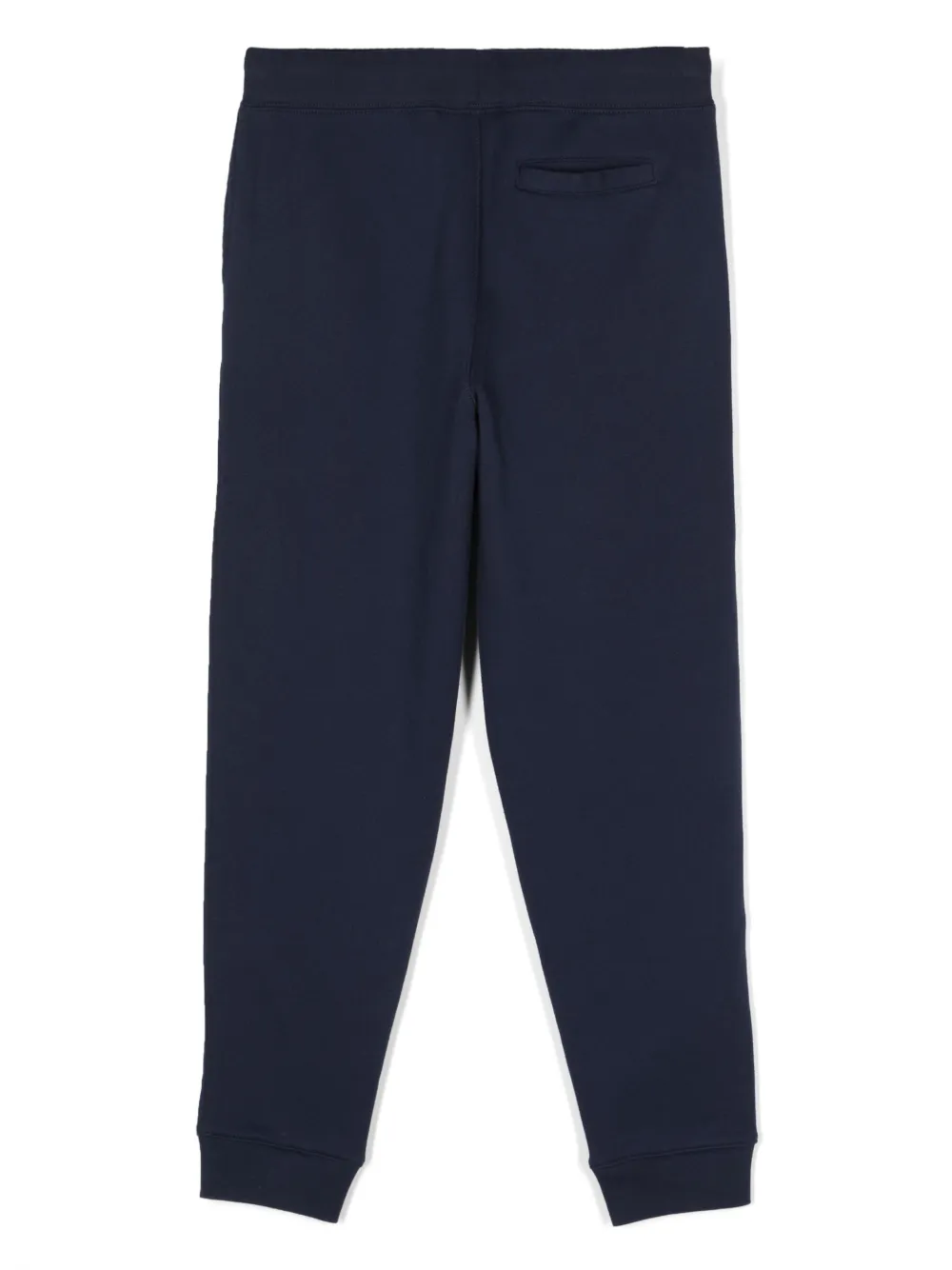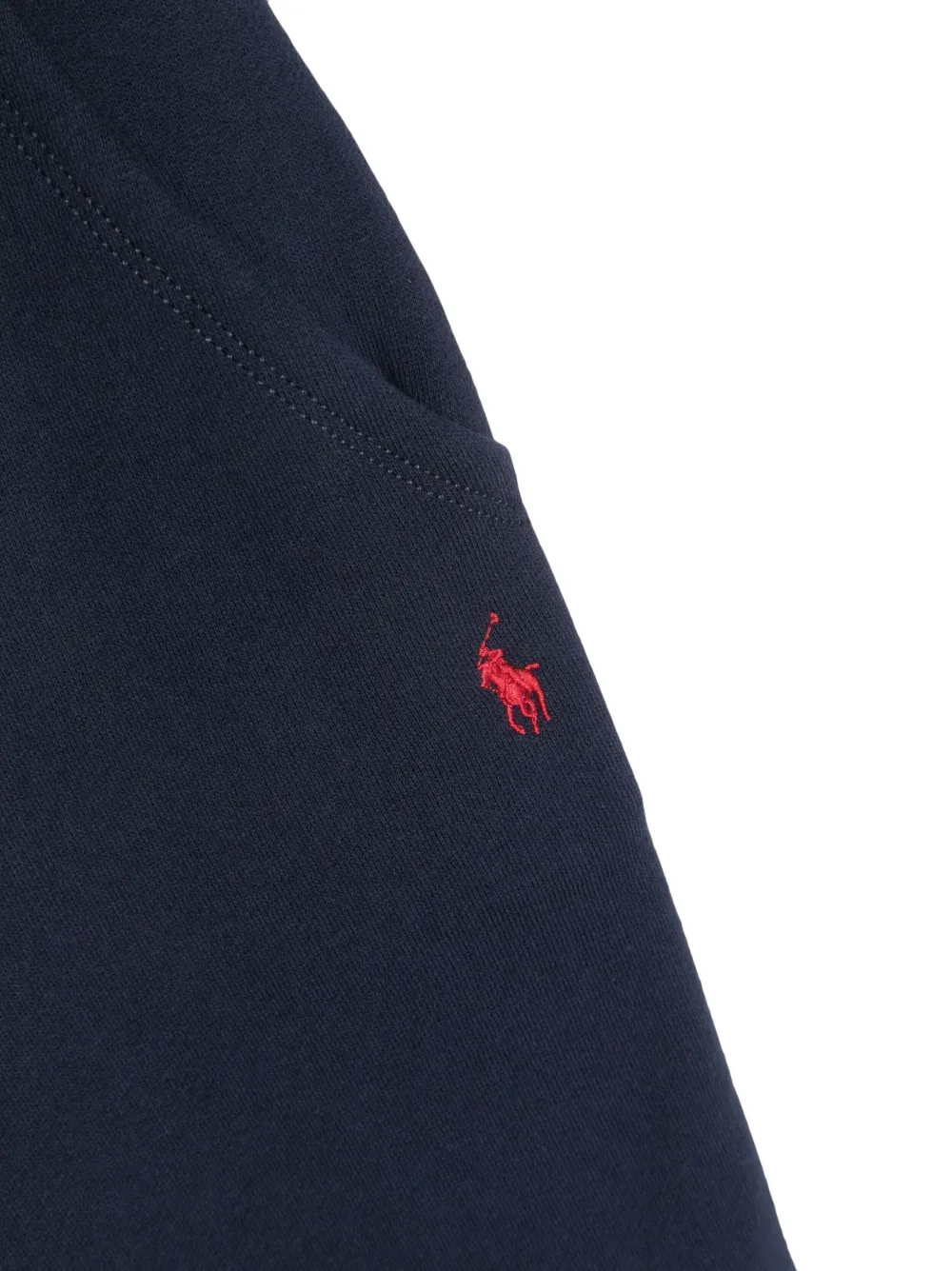 Темно-синий, смесовый хлопок, вышитый логотип спереди, кулиска на талии, эластичные манжеты, два кармана по бокам и задние карманы с листочкой.